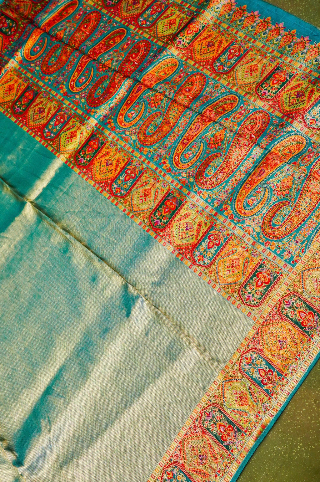 Paisley motifs are an integral part of traditional green sarees. These intricate and artistic designs add a classic touch to the saree. Our green Banarasi sarees feature a variety of paisley motifs, ranging from small and delicate to bold and elaborate. Each paisley motif tells a story and represents the rich cultural heritage of Banaras.