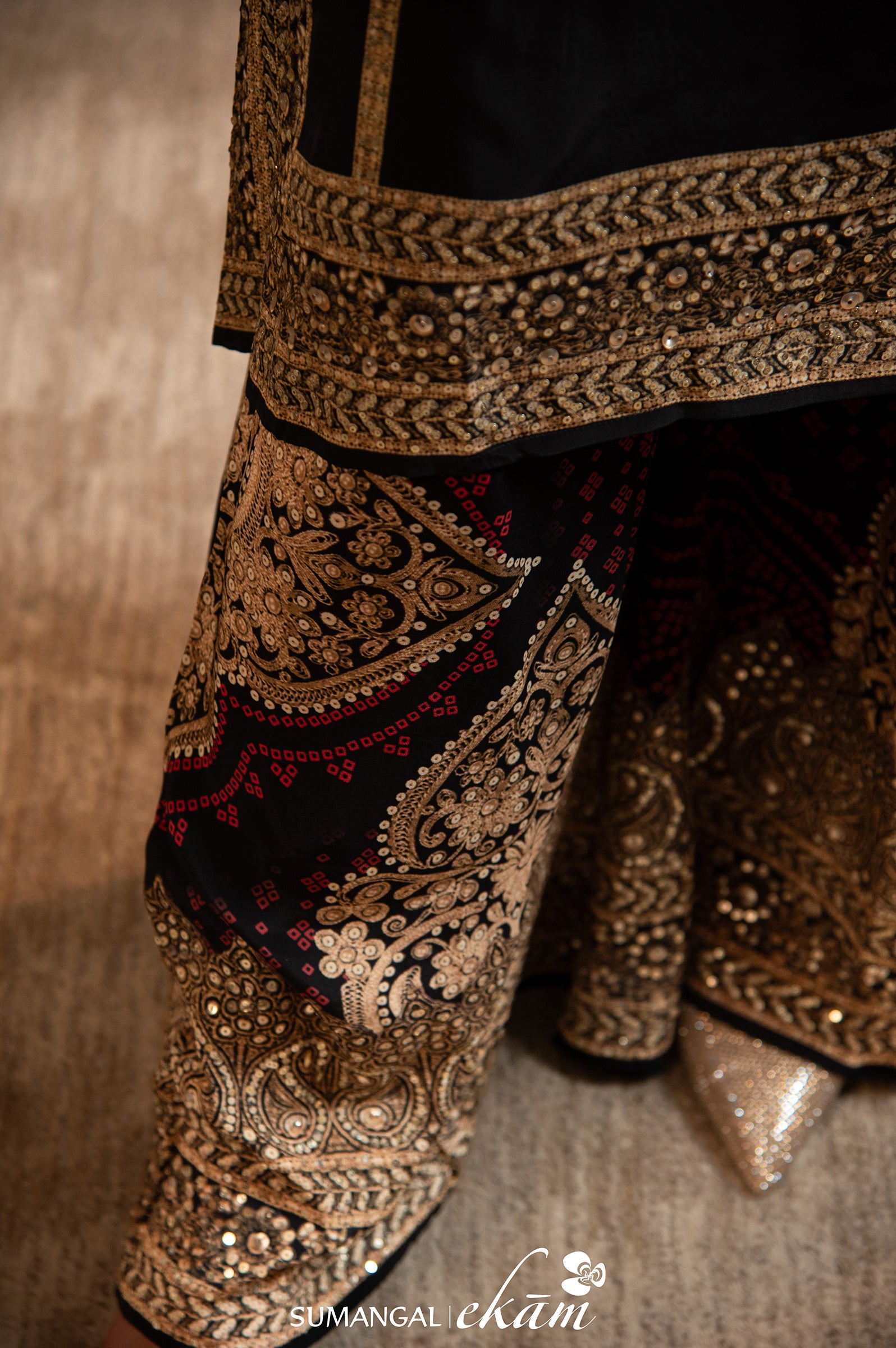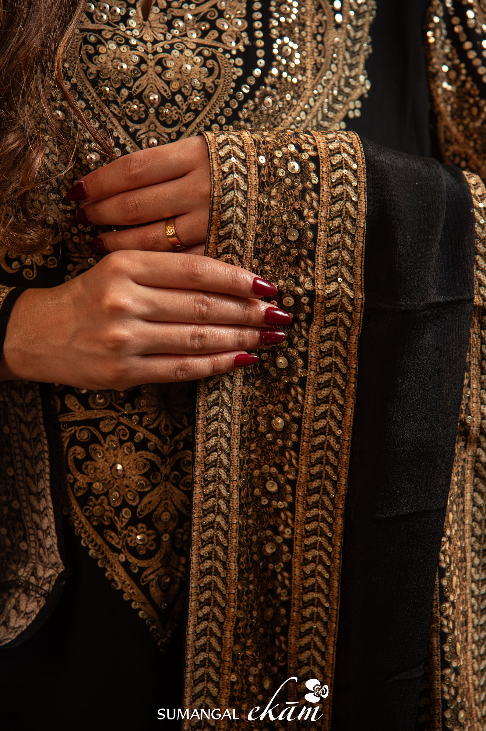 Embrace sophisticated drama with this striking black Crepe Silk suit. The kurta, a study in elegant texture, is completely enveloped in meticulous all-over hand embellishment , creating a rich, dimensional artistry. This brilliant work flows seamlessly onto the matching embellished pant , ensuring a cohesive and regal silhouette. Finished with a coordinating, detailed dupatta , this set is a truly lavish statement piece, designed for grand entrances and unforgettable nights.