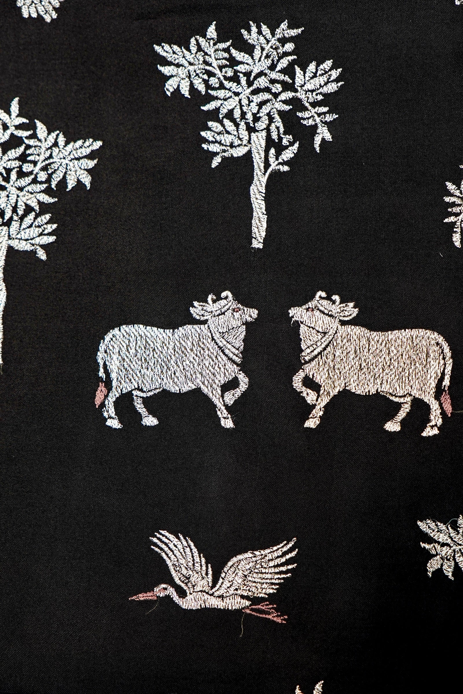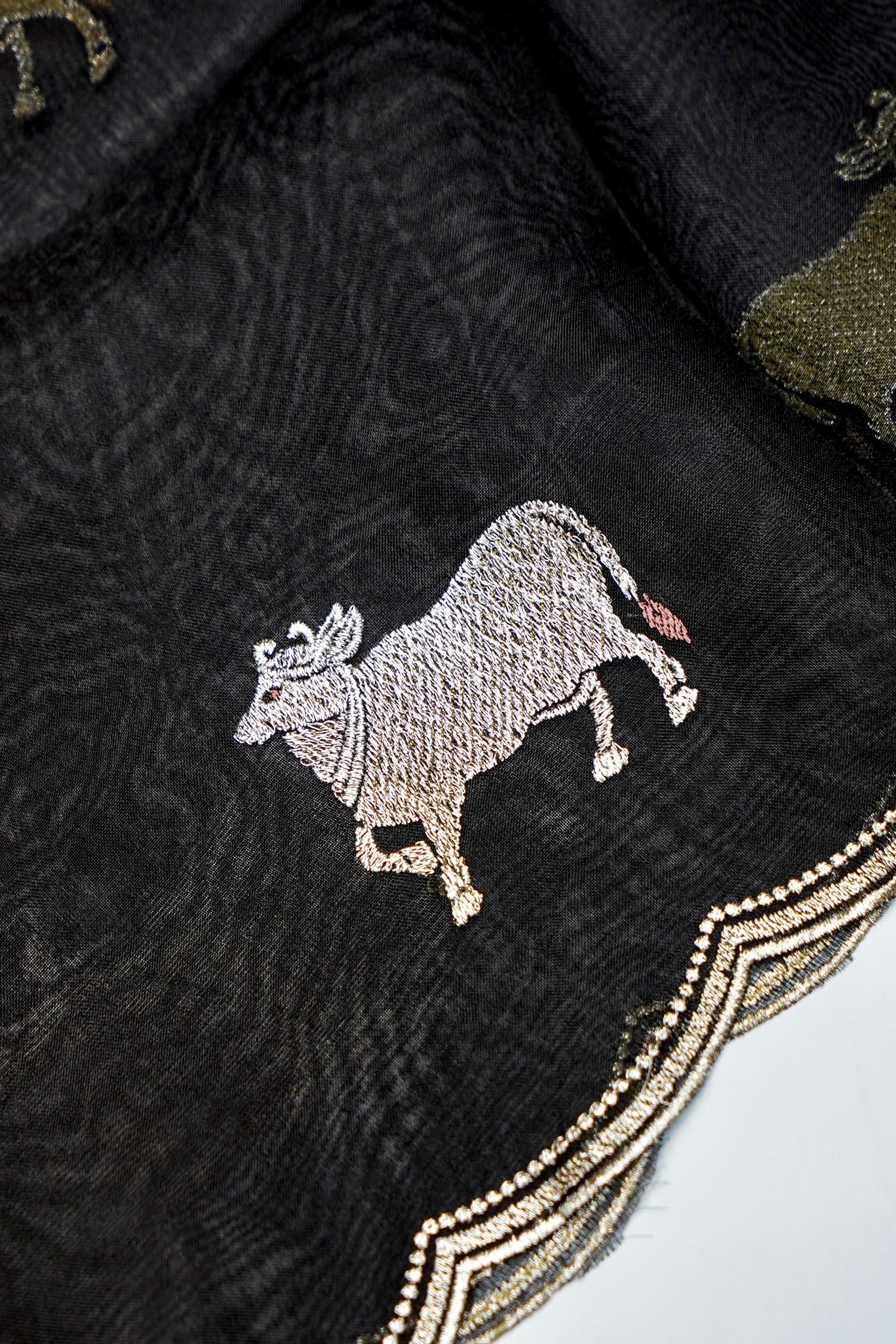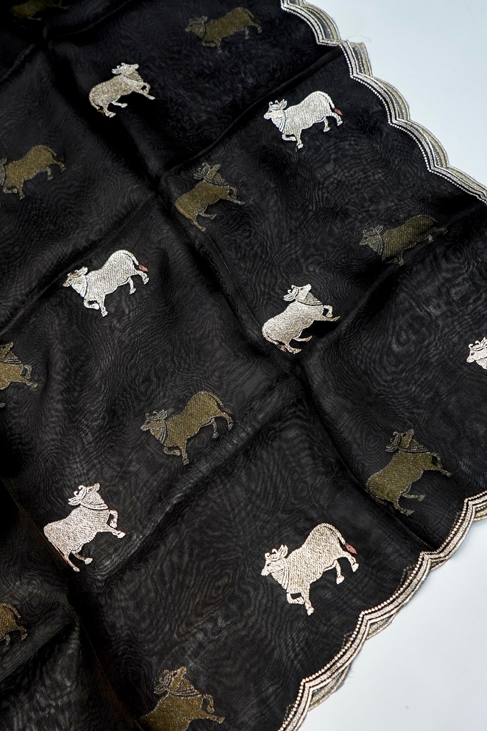 Grace meets grandeur in this exquisite Designer Black Organza Silk Saree. The saree features a beautifully woven design that exudes sophistication and timeless elegance. Its highlight is the scalloped dupatta-style border, delicately crafted to enhance the saree’s graceful drape and feminine charm.Adding to its traditional allure are the intricate Nandi motifs, symbolizing purity and devotion, meticulously woven to perfection. The soft organza silk fabric lends a luxurious texture and fluidity, making it an ideal choice for festive occasions, traditional events, or evening gatherings.