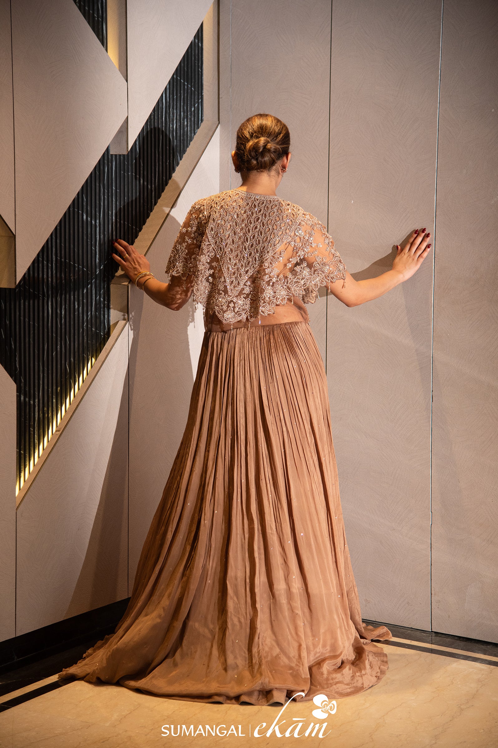 Embrace sophisticated glamour with this stunning Designer Brown Crepe Silk set. The crop top features a lavish all-over handwork blouse, showcasing rich, meticulous artistry that exudes luxury. This exquisite detailing extends beautifully to the coordinating handwork skirt, creating a flowing, harmonious silhouette. A matching handwork shrug completes the look, adding an element of contemporary grace and versatility. This is the definition of refined, statement party wear.