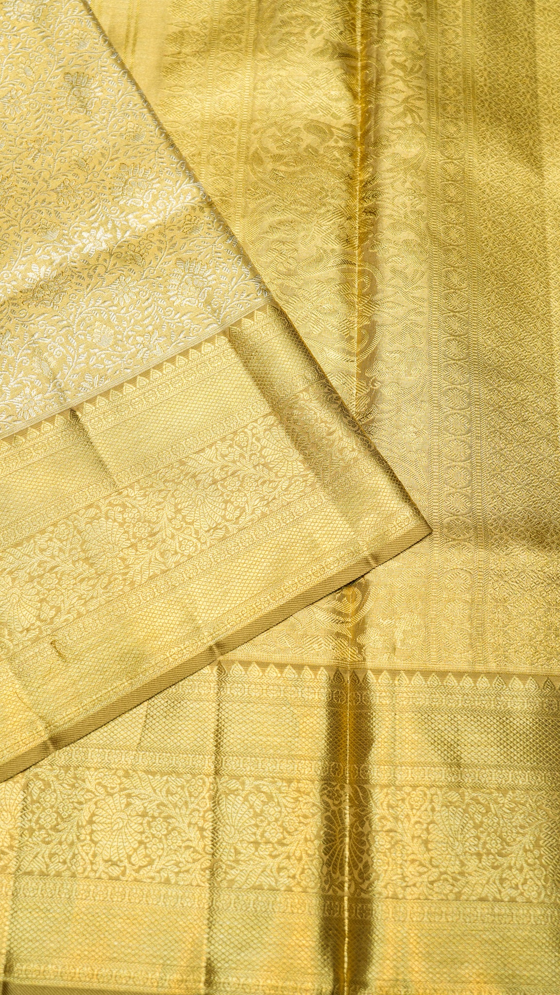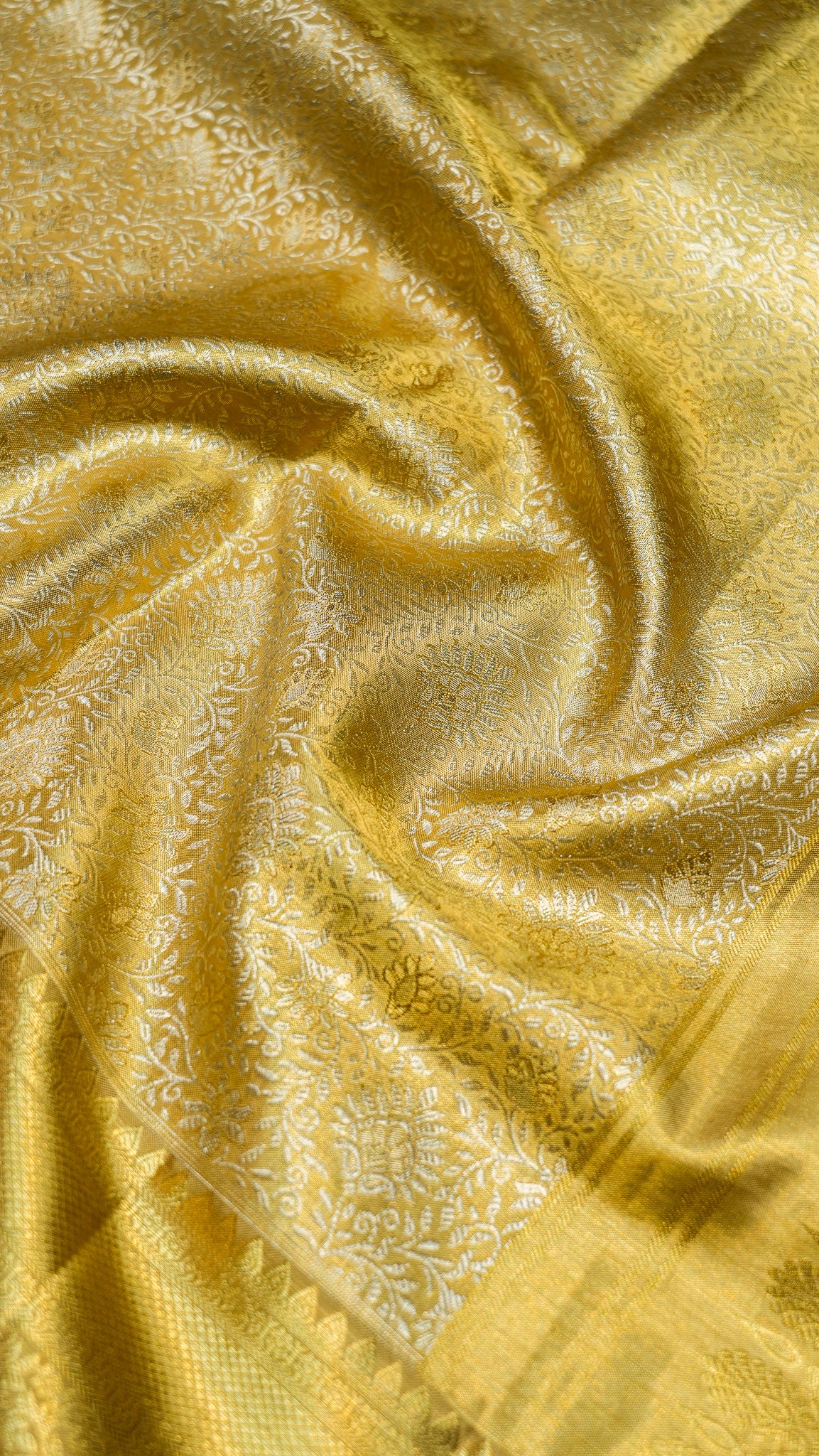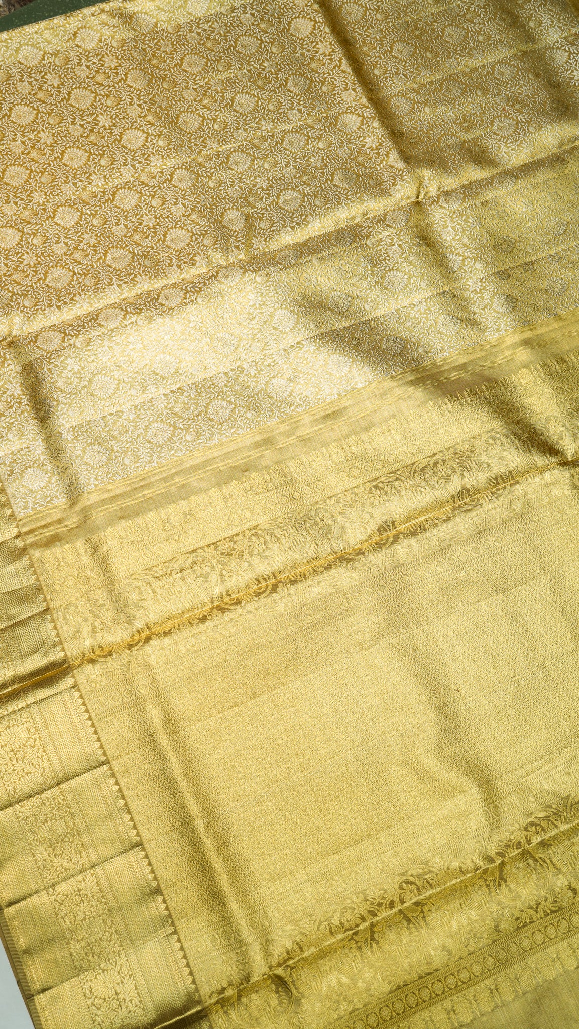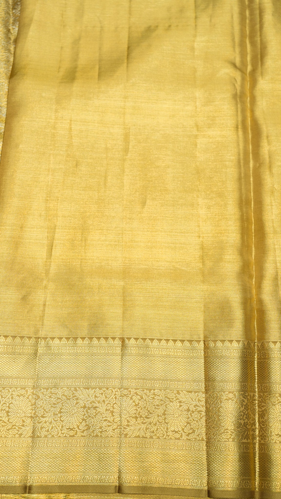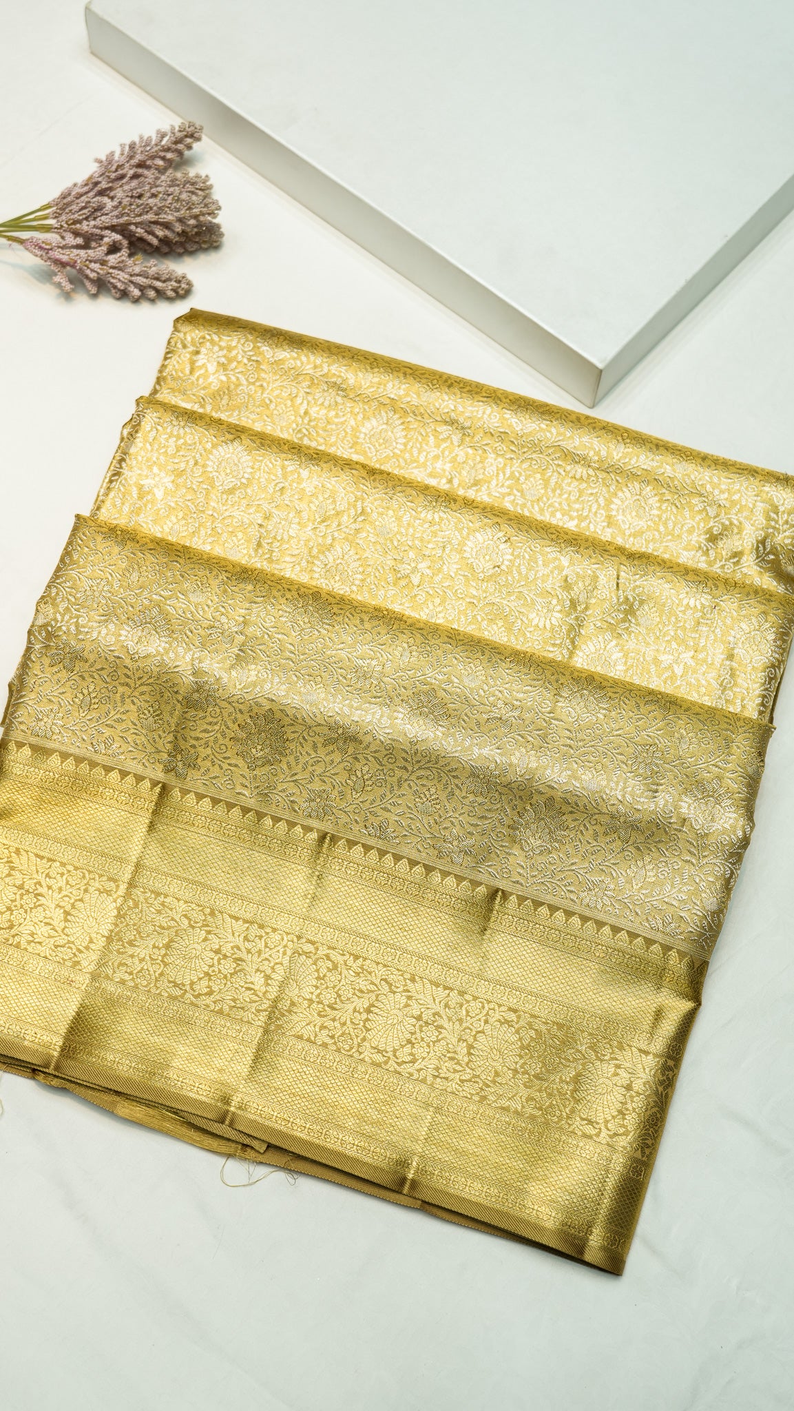 This Designer Golden Kanjivaram Silk Saree radiates pure elegance and opulence. Crafted from luxurious silk, it showcases exquisite zari weaving in intricate floral and geometric patterns that reflect the heritage of South Indian craftsmanship. The rich golden hue adds a regal glow, perfect for festive occasions, weddings, and grand celebrations. Its intricately designed pallu and ornate border elevate its beauty, giving it a timeless appeal. Paired with a matching blouse, this saree beautifully blends traditional artistry with a sophisticated modern charm, making it a statement piece in any ethnic wardrobe.