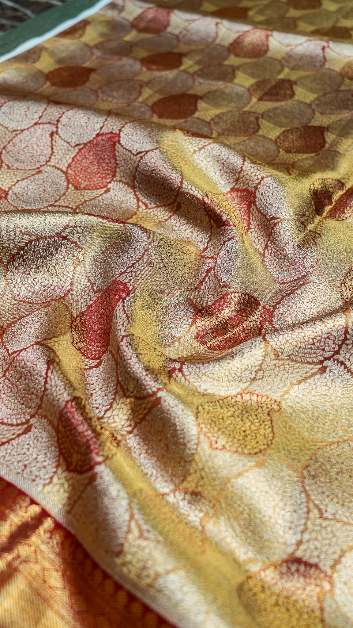 This exquisite Designer Golden Maroon Kanjivaram Silk Saree embodies timeless beauty and regal charm. The golden body is intricately woven with delicate circular zari motifs that shimmer with elegance. The maroon border and pallu feature rich floral and paisley zari patterns, enhancing its luxurious appeal. Handcrafted with traditional weaving artistry, this saree captures the essence of classic Kanjivaram grandeur. Perfect for weddings, festive occasions, and grand celebrations, it comes paired with a matching self-blouse to complete your royal ensemble.