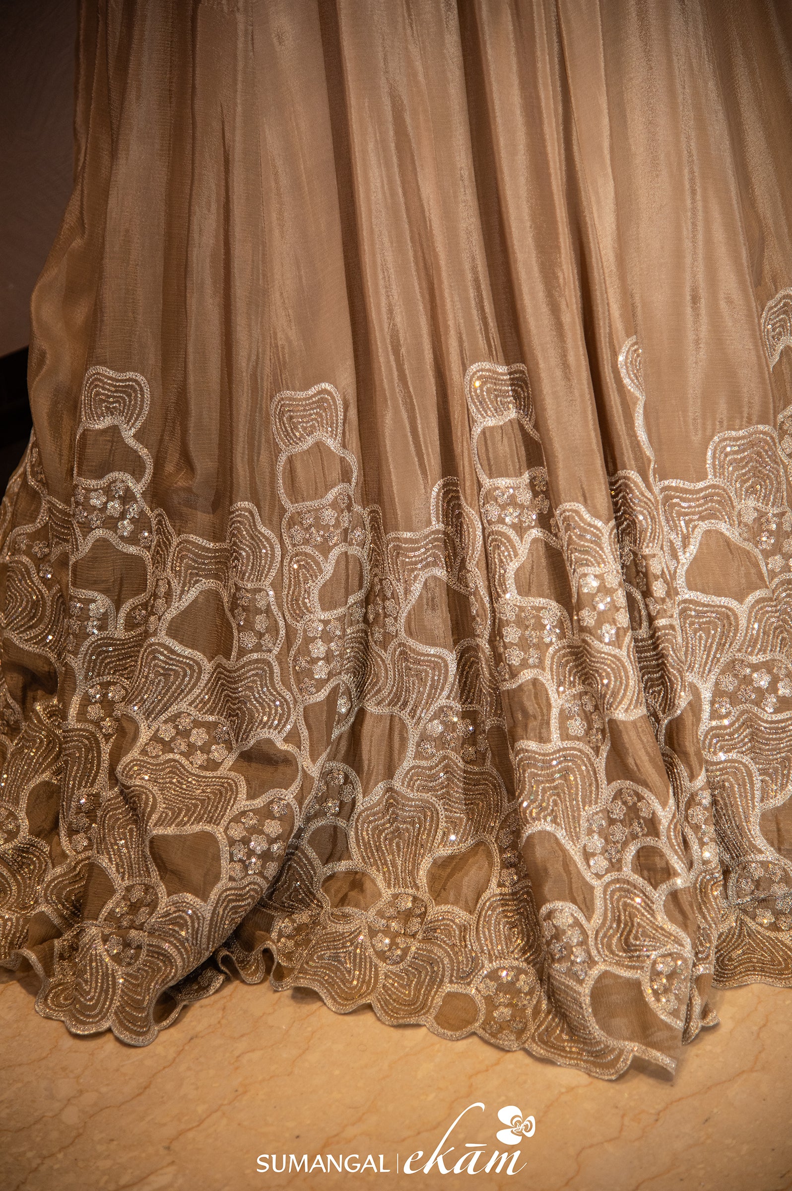 Radiate pure luxury in this exquisite designer ensemble. The Golden Tissue Silk Crop Top offers a luminous sheen, serving as the perfect canvas for breathtaking all-over handwork . This intricate detailing, crafted by master artisans, flows seamlessly onto the equally stunning handwork bottom , making for a cohesive, head-turning look. The rich texture and brilliant hue guarantee a truly opulent presentation. This is the definition of statement dressing.