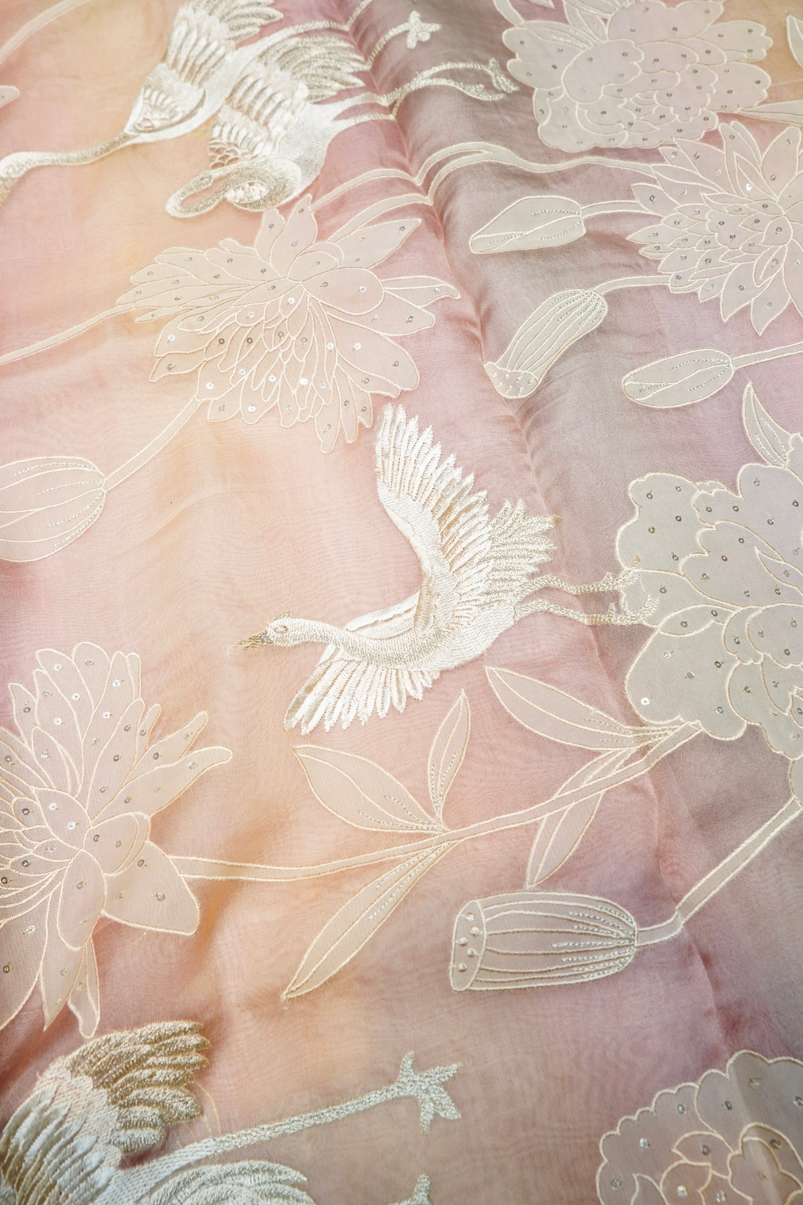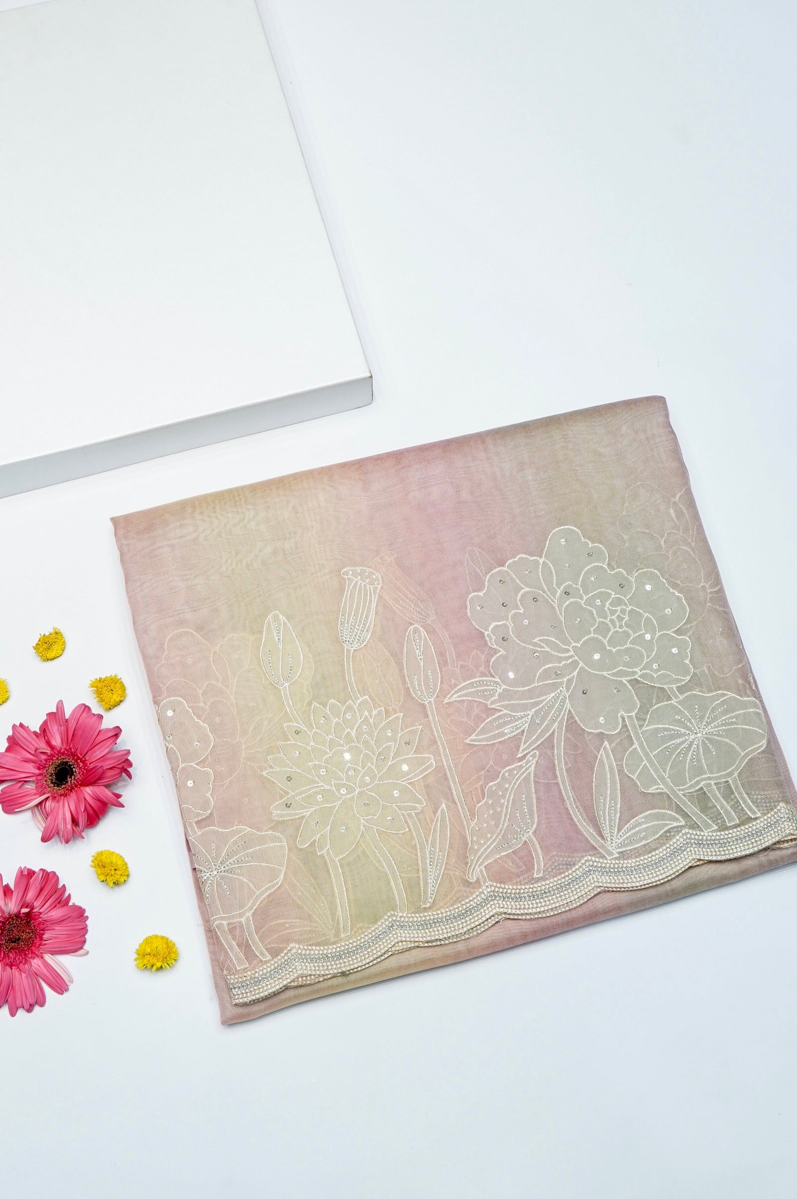 This elegant saree is crafted in Handwoven Banarasi Katan Silk, showcasing a delicate blush pink base gently blended with peach hues and subtle champagne highlights; the fabric is adorned with fine floral embroidery and tiny embellishments that add a refined shimmer, while the sheer texture and smooth Katan silk weave ensure a graceful fall and luxurious feel, making it a perfect choice for weddings, festive gatherings, and sophisticated occasions where timeless Banarasi craftsmanship meets soft, feminine elegance.