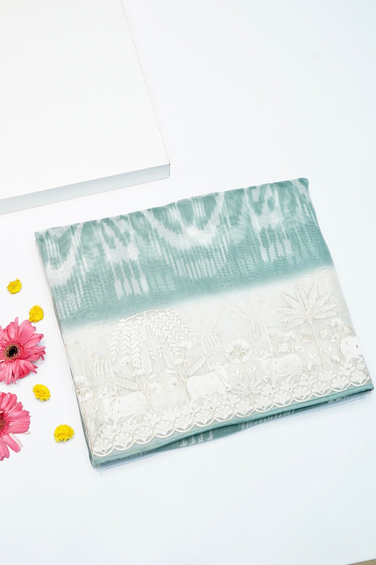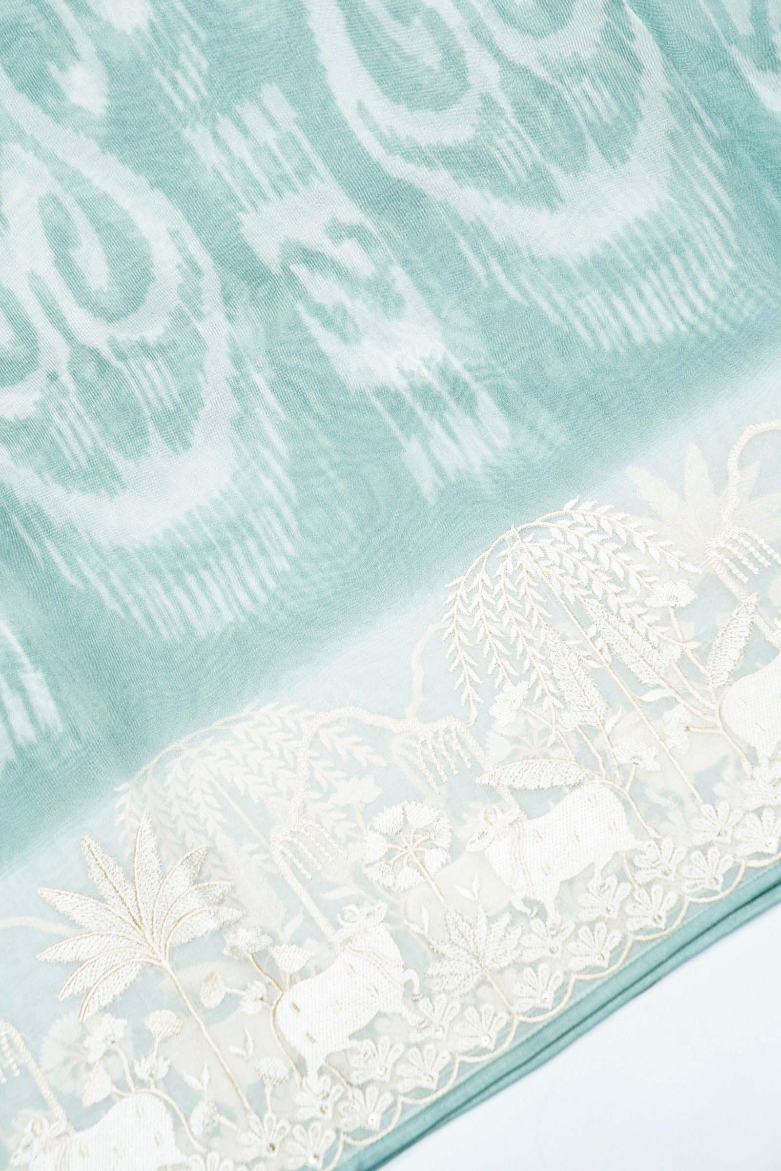 This graceful saree is crafted in Handwoven Banarasi Katan Silk, featuring a soothing mint green base beautifully complemented by intricate ivory floral embroidery and delicate textured detailing that enhances its refined charm; the luxurious Katan silk weave offers a natural sheen, smooth finish, and fluid drape, while the subtle pastel tone makes it ideal for daytime weddings, festive occasions, and sophisticated celebrations, reflecting timeless Banarasi craftsmanship blended with modern elegance and understated luxury.