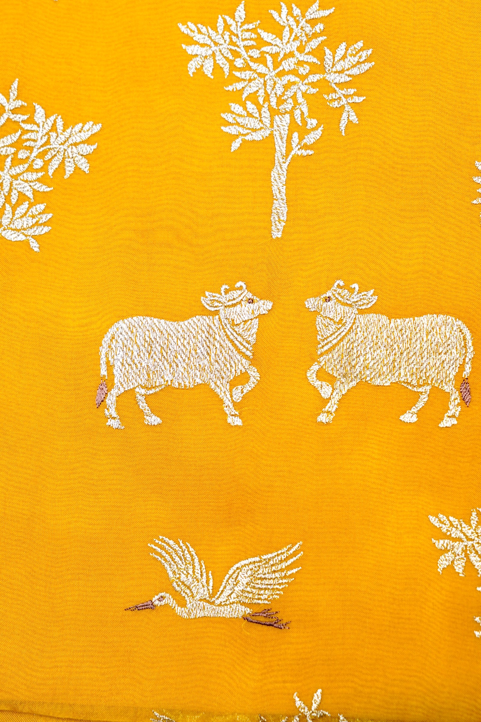 Radiate grace and tradition with this Designer Yellow Organza Silk Suit Set, beautifully woven with intricate craftsmanship. The suit features all-over Nandi motifs with elegant tree designs, symbolizing devotion and prosperity, adding a touch of cultural richness to the ensemble. Paired with a matching organza dupatta adorned with all-over Nandi motifs and finished with a delicate scalloped border, it exudes timeless sophistication.Lightweight, elegant, and ethereal — this suit set is perfect for festive occasions, traditional celebrations, and graceful daytime gatherings.