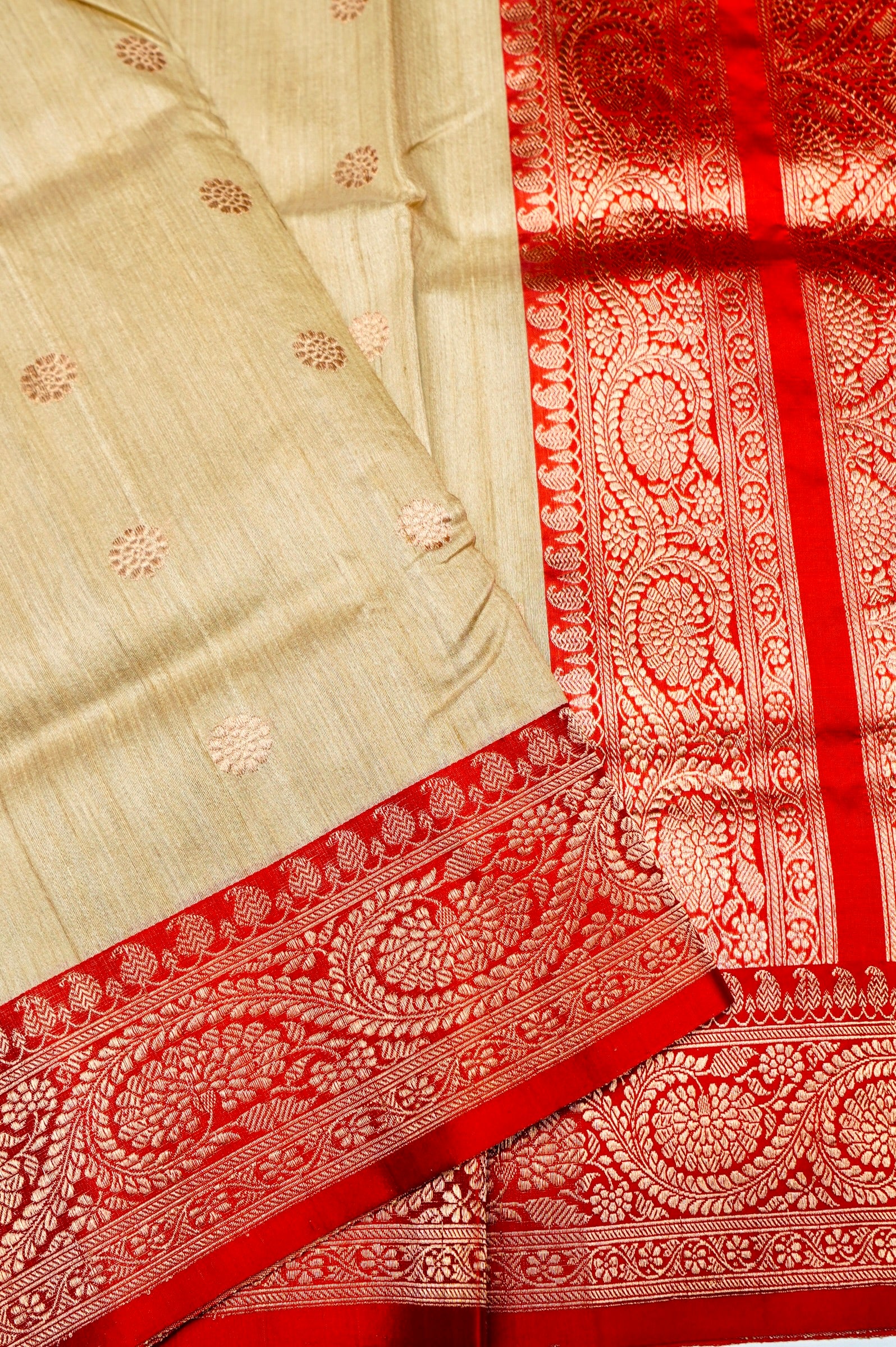 This Handwoven Tussar Silk Saree is an epitome of understated luxury and timeless grace. The natural beige Tussar body, adorned with delicate zari butis, exudes a soft, earthy elegance, while the contrasting rich red border and pallu showcase intricate floral and paisley motifs woven in resplendent gold zari. The luminous texture of Tussar silk adds a refined sophistication to the drape. Paired with a striking contrast red blouse, this saree beautifully balances tradition and contemporary charm — perfect for festive occasions, weddings, or elegant celebration