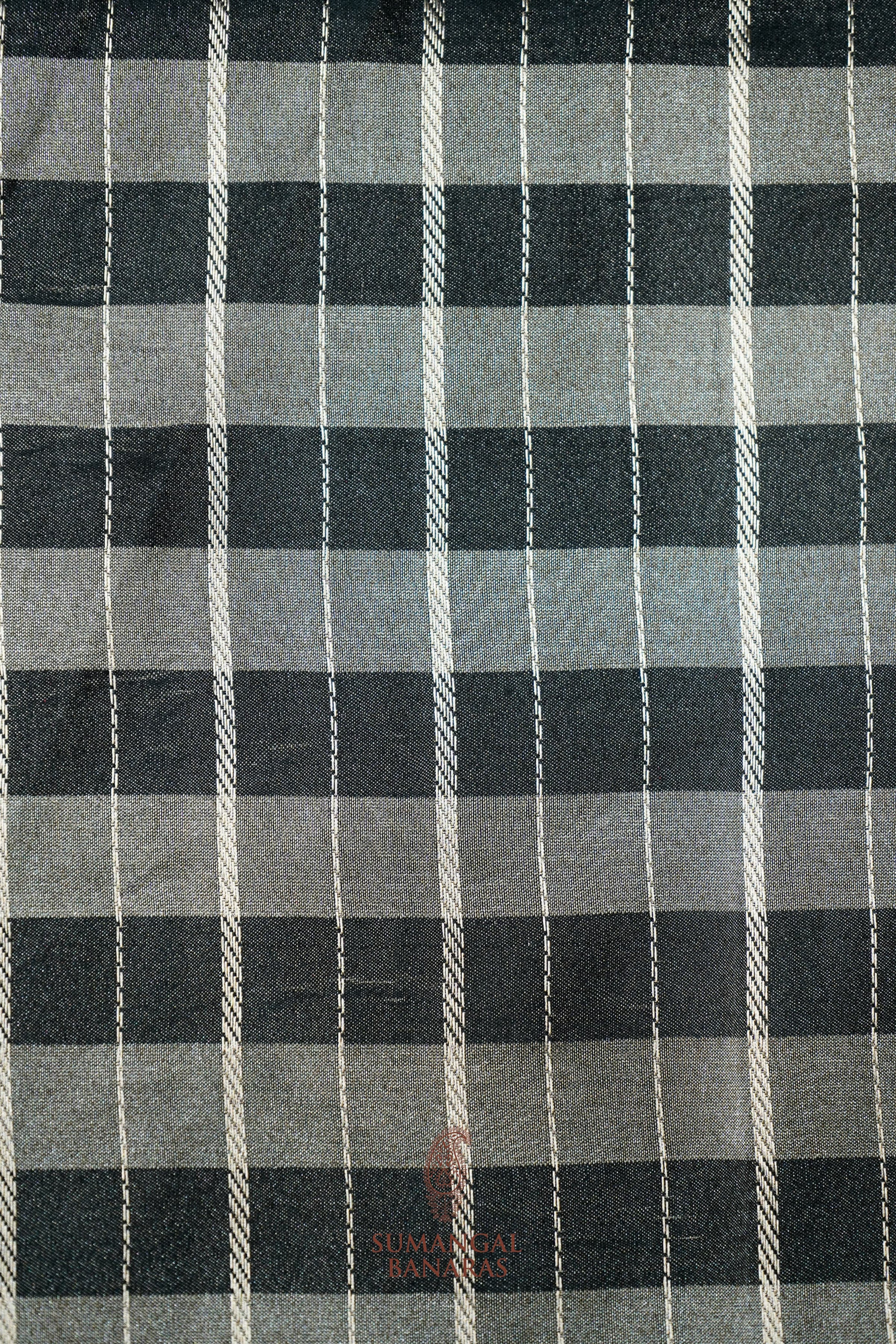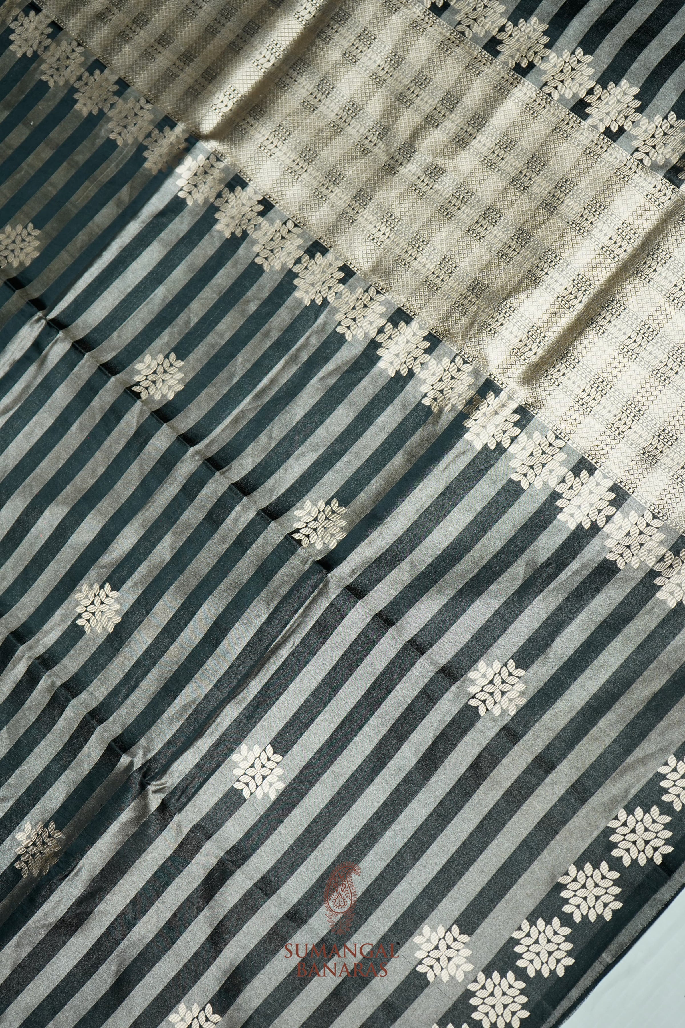 Experience the subtle luxury of this handwoven Black Banarasi Mashru Silk saree. The fabric offers a beautiful, unique sheen, providing a sophisticated backdrop for the elegant design. The body features a refined all-over black and grey stripe pattern, lending depth and linearity. Across this canvas, delicate bootis are intricately woven, creating a textured contrast. Paired with a matching self-blouse, this piece is an understated yet powerful statement of classic, heirloom elegance.