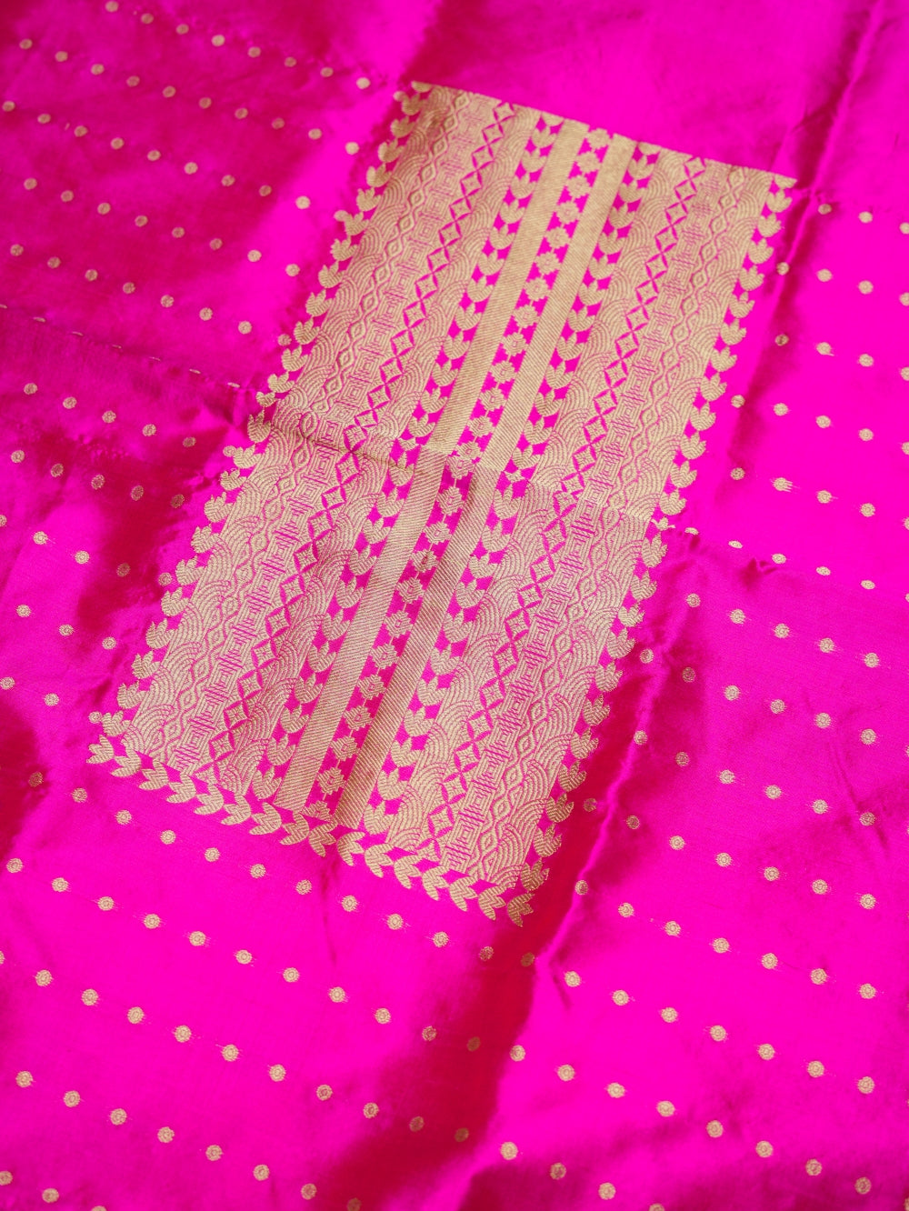 Vibrant and graceful, this Handwoven Rani Pink Banarasi Katan Silk Co-ord Set is a celebration of classic Banarasi elegance. Crafted from premium Katan silk, it features intricate zari weaving spread beautifully across the fabric, forming traditional geometric and floral patterns. The rich rani pink hue enhances the golden zari, creating a striking festive appeal. Finished with finely woven borders, this suit is perfect for weddings, festivities, and special occasions, reflecting timeless craftsmanship and royal charm.