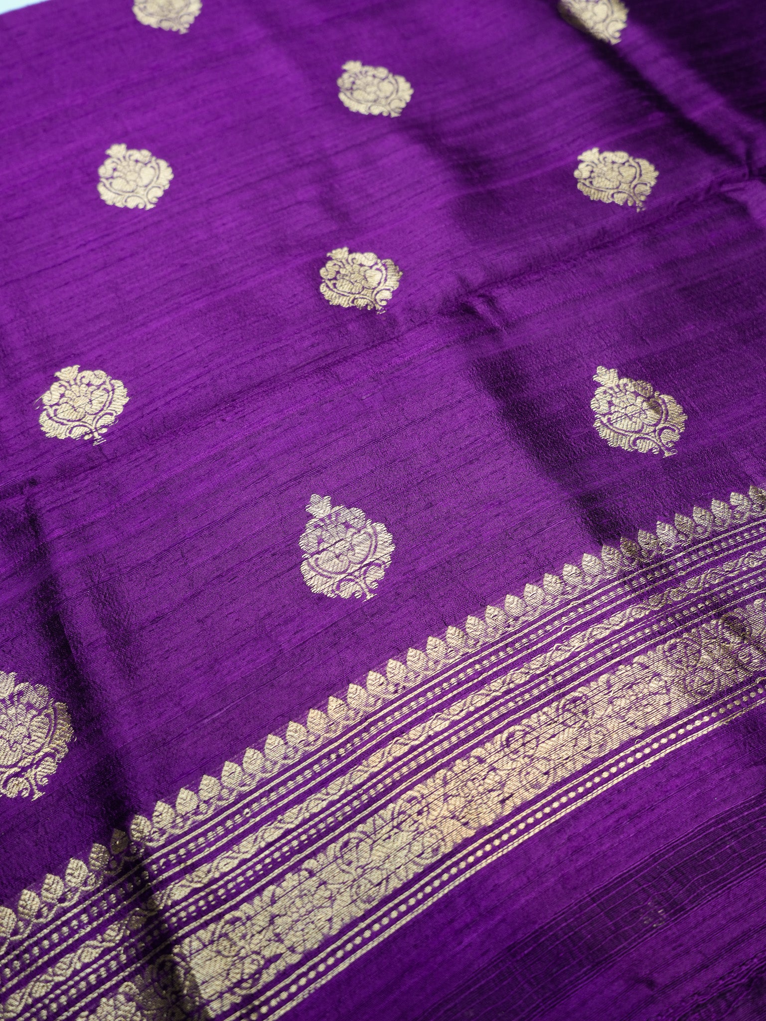 Rich wine-toned Banarasi raw silk defines the kurta, accented with finely scattered golden zari motifs that add depth and quiet brilliance to the surface. The raw silk texture keeps the look refined while preserving a handcrafted character. A rani pink organza dupatta introduces a bold contrast, finished with delicate golden zari detailing along the edges for a soft shimmer. Together, the deep base and vibrant overlay create a graceful balance of colour and tradition, making the suit an elegant choice for festive gatherings, celebrations, and special occasions where classic Banarasi artistry feels timeless yet expressive.