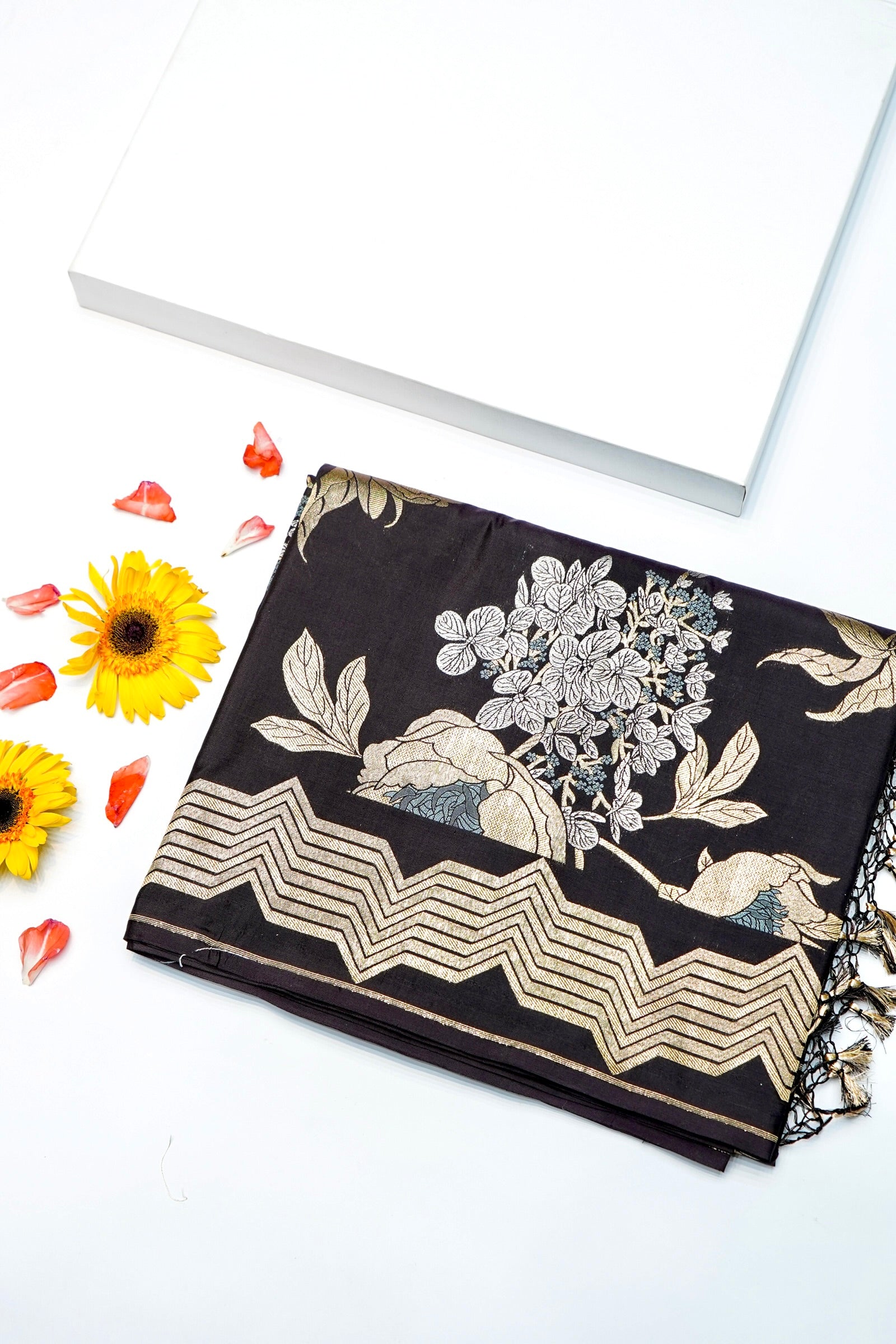 Experience timeless artistry with this Handwoven Black Brown Banarasi Katan Silk Saree, adorned with grand floral motifs in gold and silver zari weaving. The delicate blend of shimmering zari and pastel blue threadwork creates an enchanting contrast against the deep black-brown base. Its chevron-patterned zari border and pallu enhance the saree’s regal appeal. Woven using the traditional Kadhwa technique, this masterpiece comes paired with a matching self blouse, making it perfect for festive celebrations and elegant evening occasions.