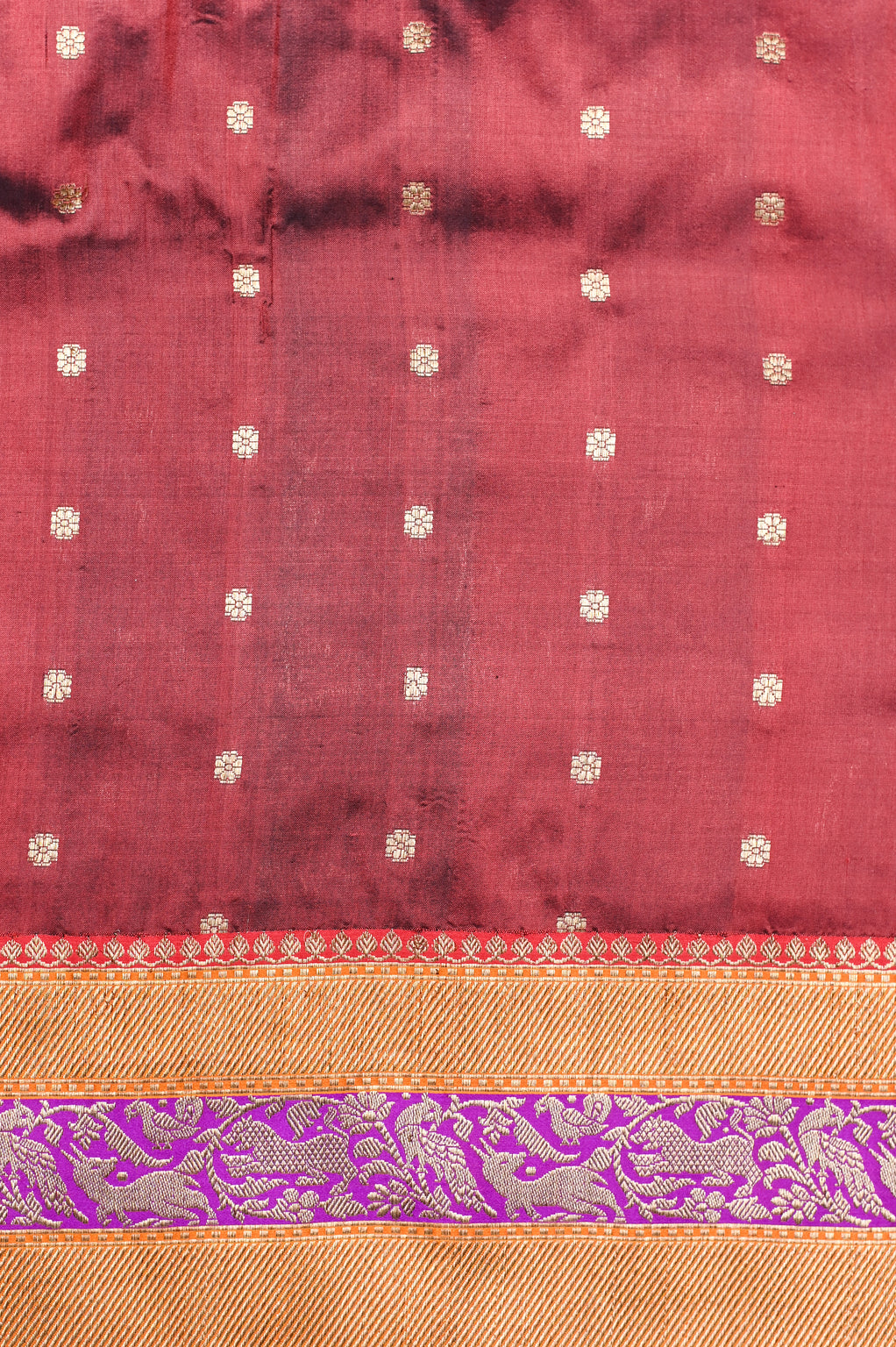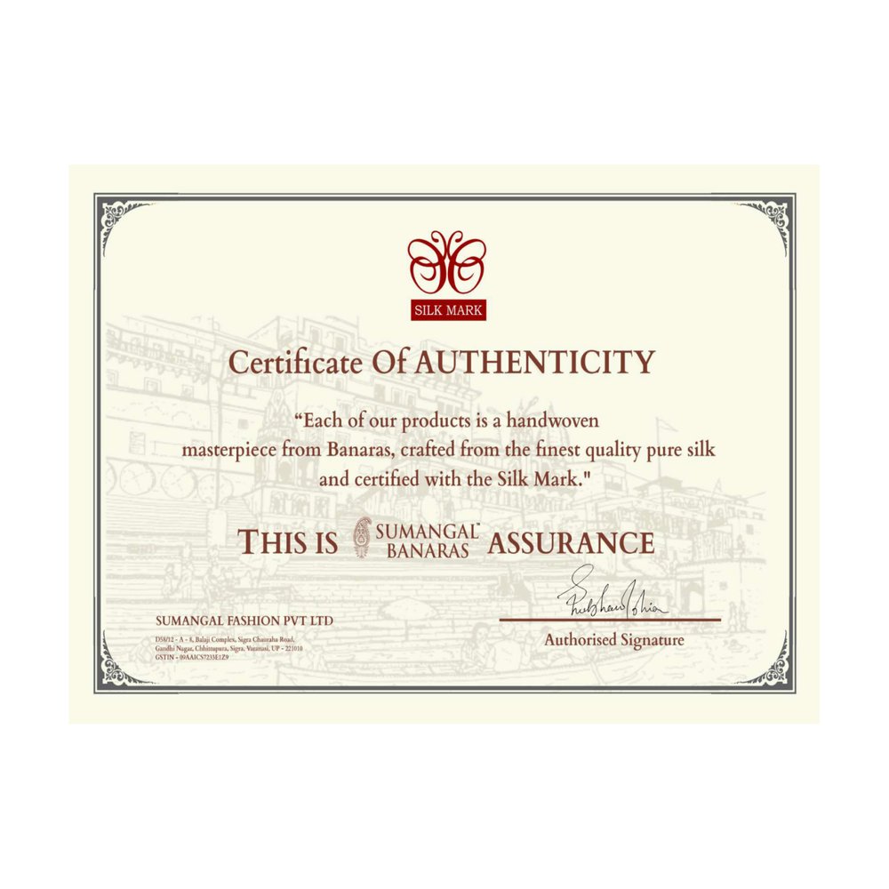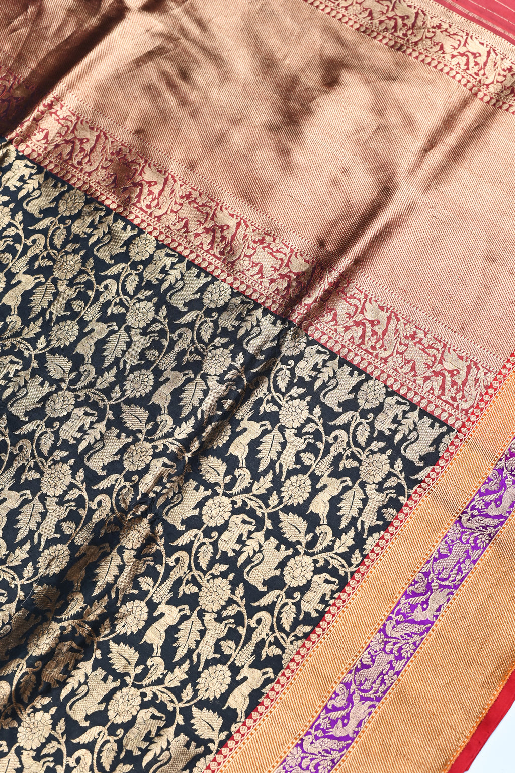 Handwoven Black Shikargah Banarasi Katan Silk Saree showcases the grandeur of classic Banaras artistry. Rich black silk forms the base, intricately woven with antique gold zari shikargah motifs featuring animals, foliage, and traditional forest scenes. The detailed body contrasts beautifully with an opulent pallu and finely crafted border, adding depth and regal character. Smooth Katan silk lends a graceful fall and subtle sheen. Paired with a contrasting blouse, the saree suits weddings, festive occasions, and collectors who value heritage weaves and timeless elegance.