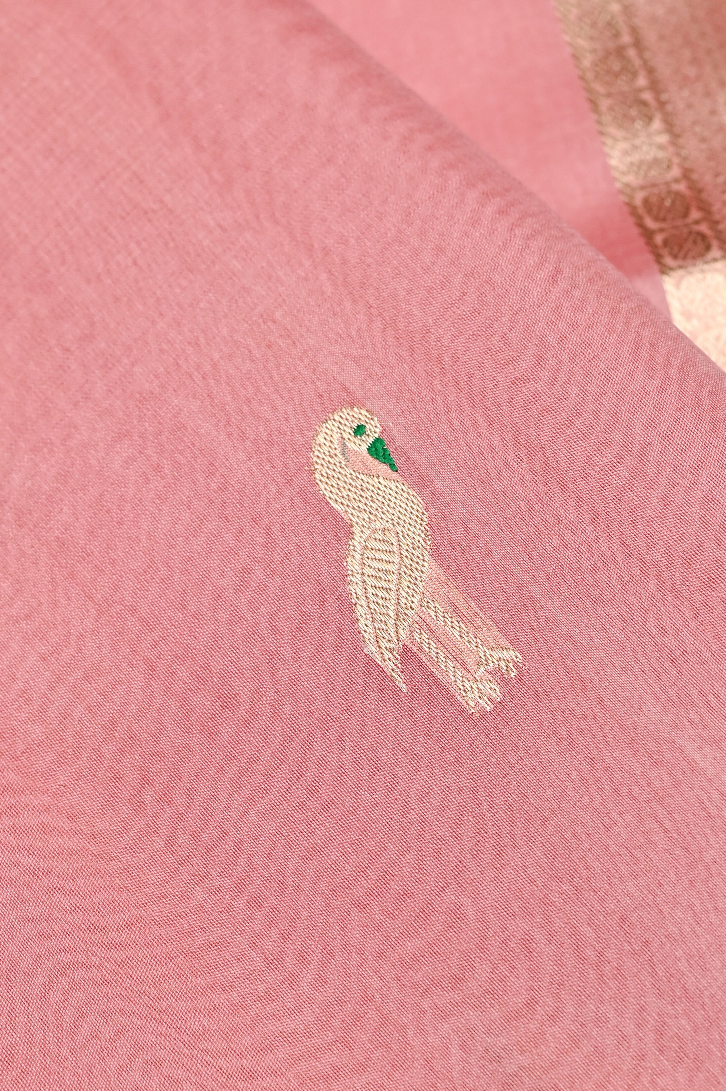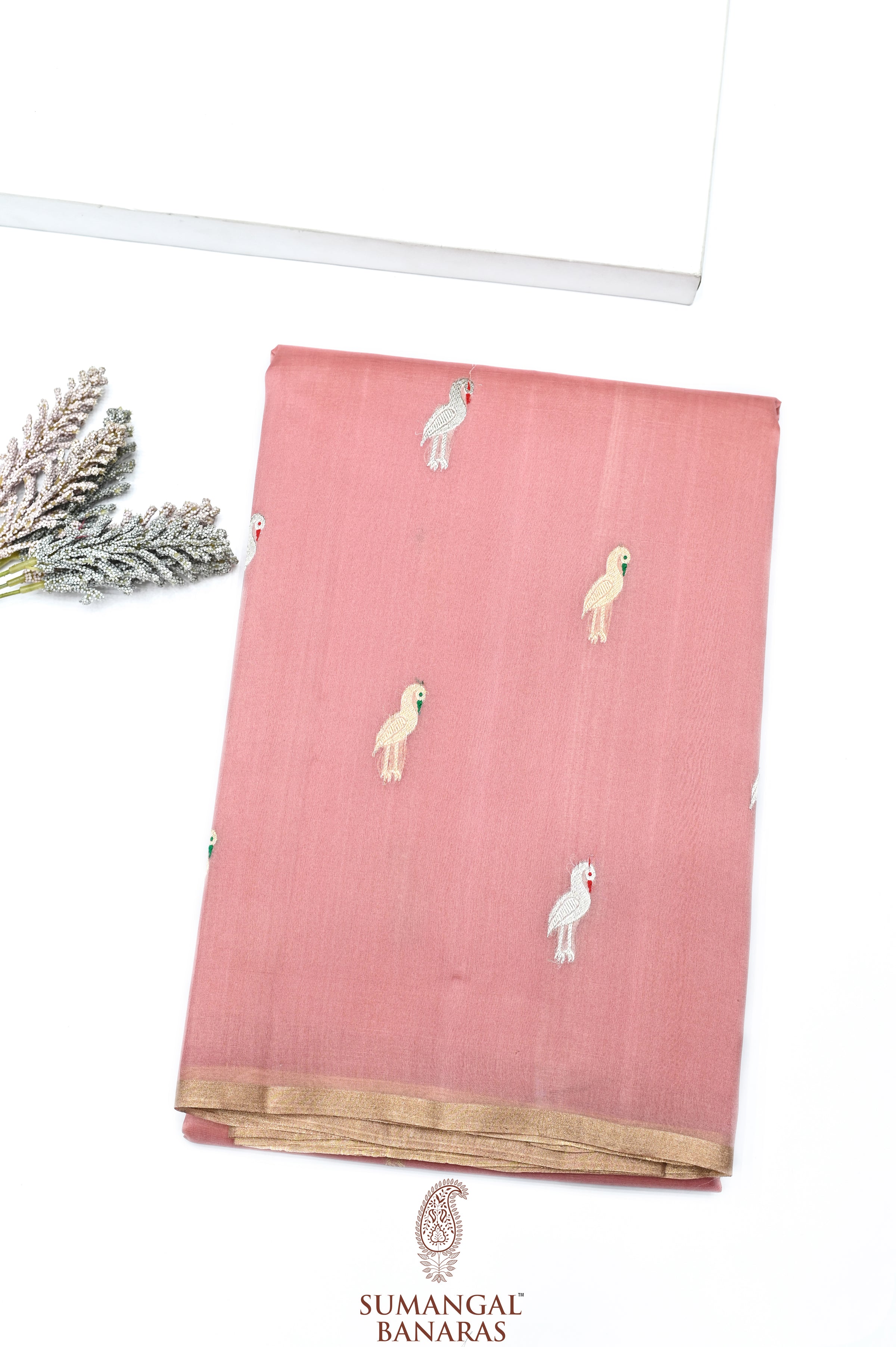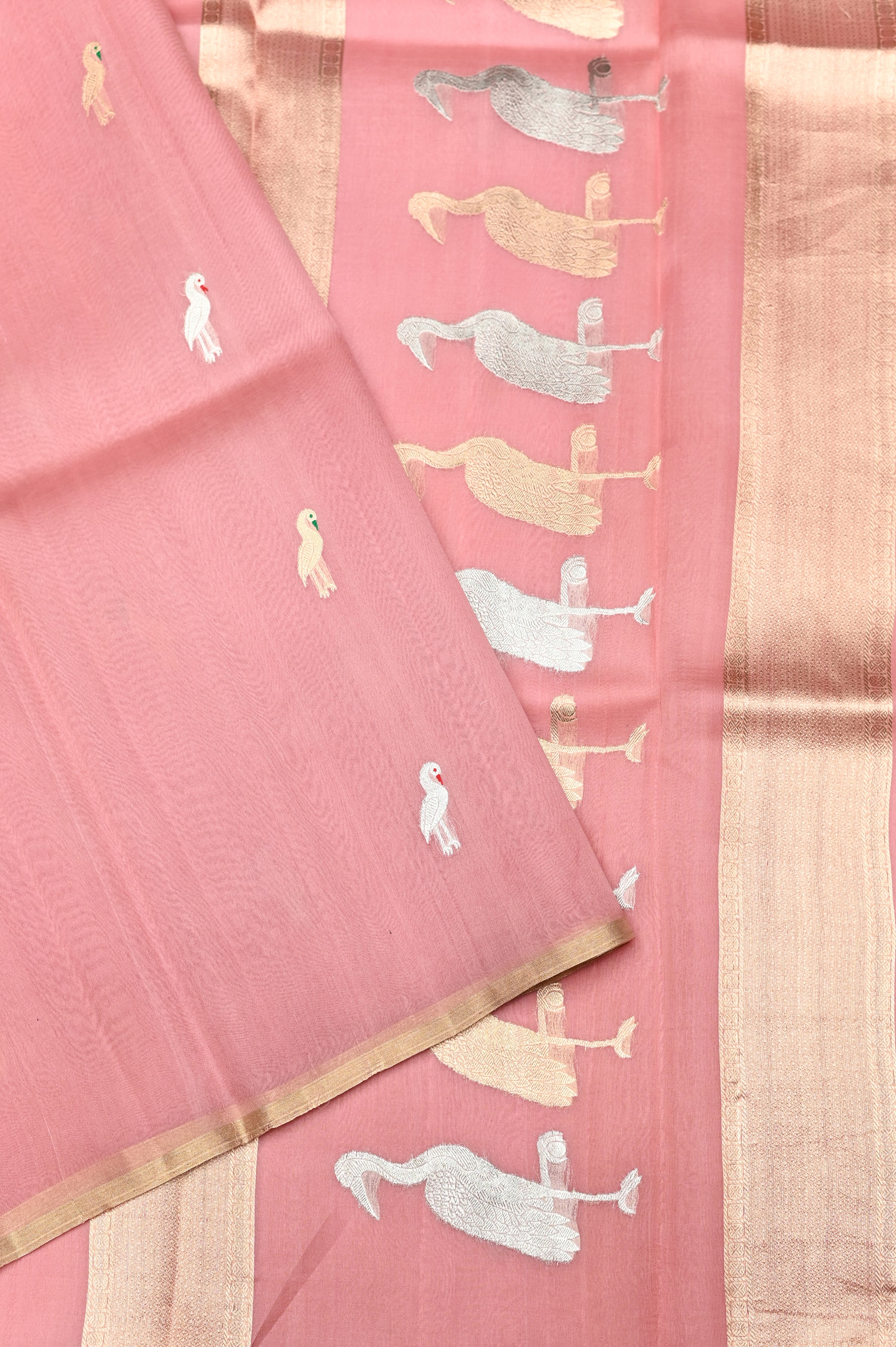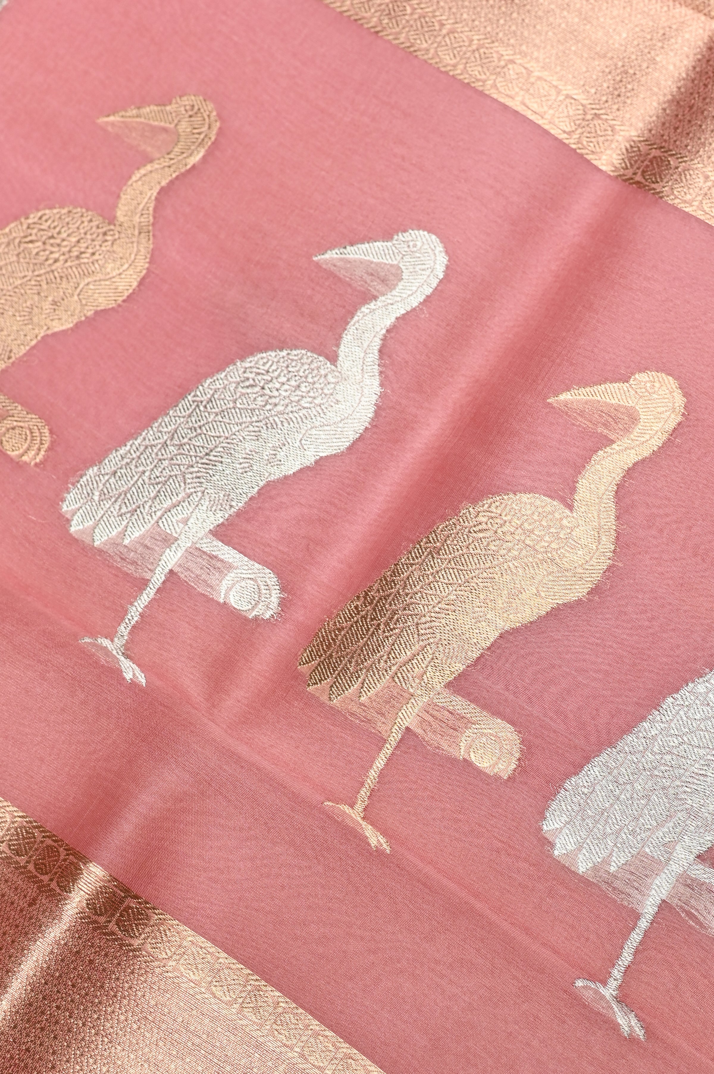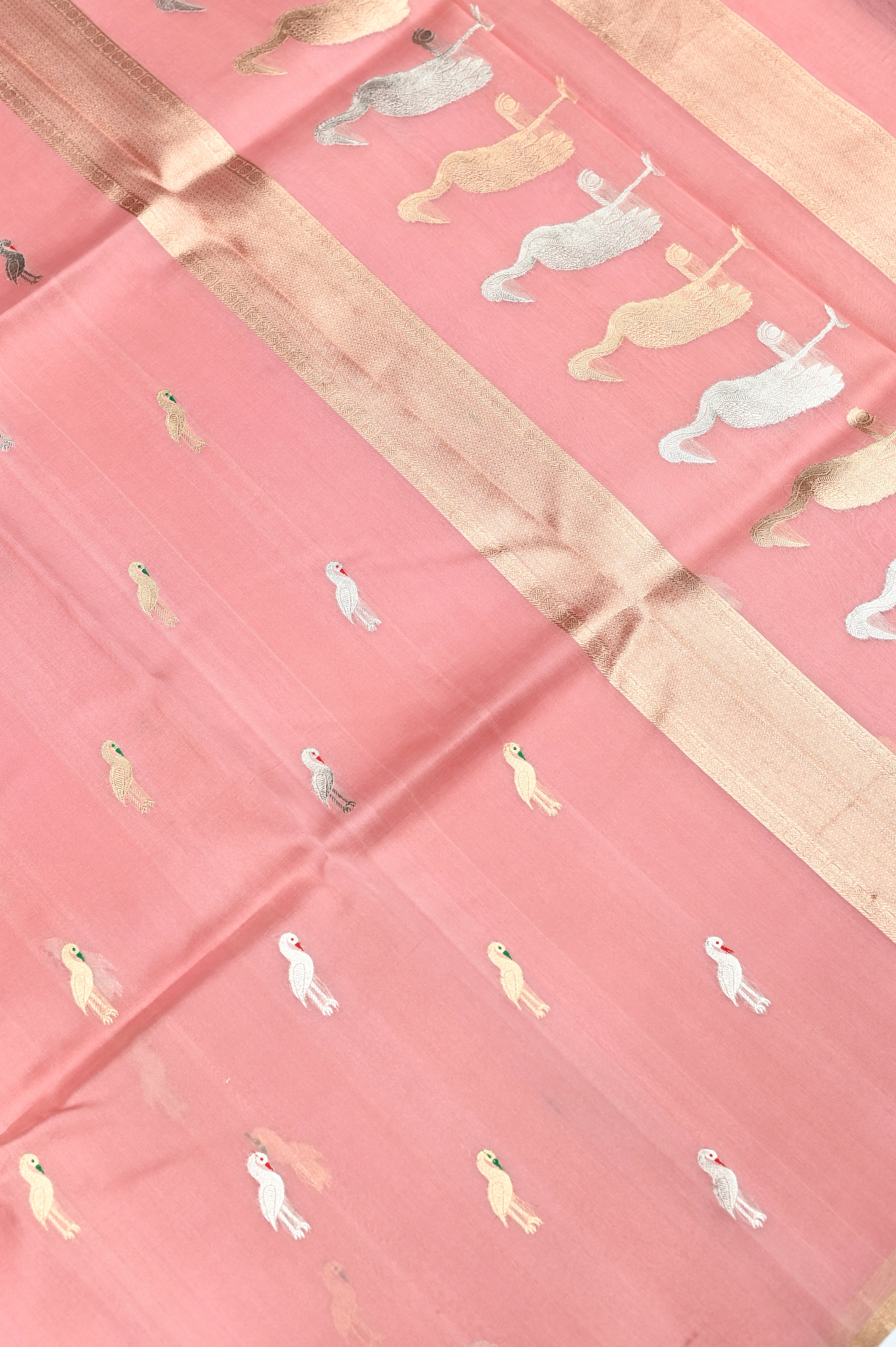 This Handwoven Banarasi Organza Saree in a soft peach tone exudes subtle luxury and timeless charm. Expertly woven by skilled Banaras artisans, the saree features a luminous tissue silk base highlighted with delicate bird motifs and refined zari accents. The gentle sheen of the fabric enhances its airy drape, making it ideal for weddings, festive occasions, day functions, and elegant celebrations. Finished with a graceful Banarasi border, this blush peach saree beautifully balances tradition and modern sophistication, adding a serene yet royal touch to any ethnic wardrobe.
