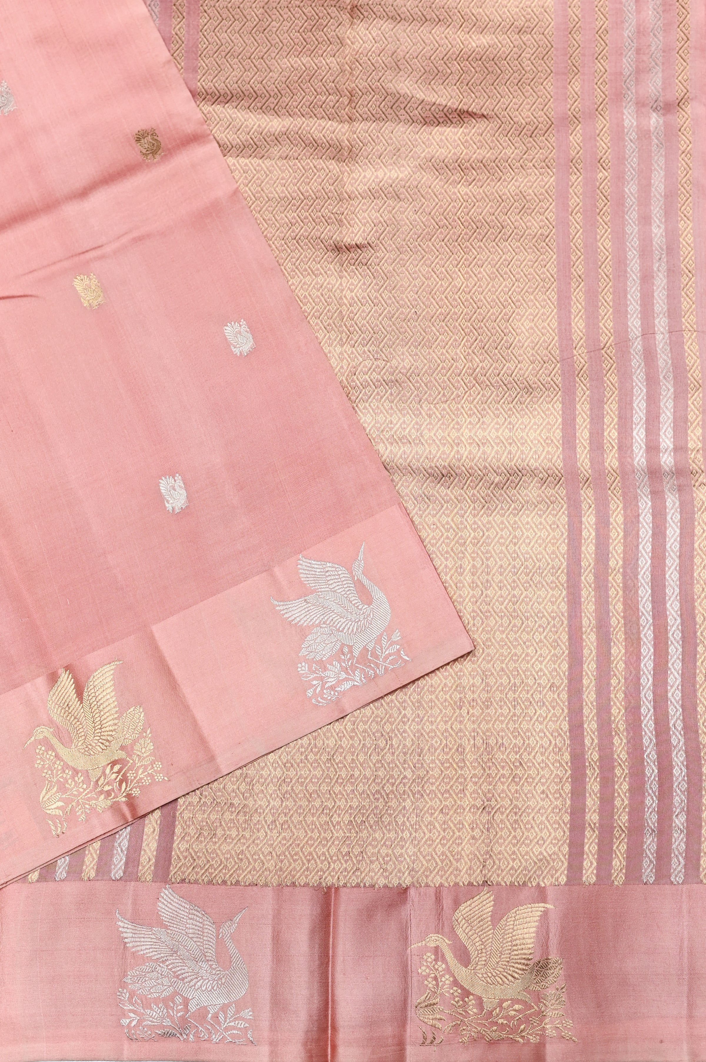 Celebrate graceful elegance with this Handwoven Blush Rose Banarasi Katan Silk Saree, a timeless expression of refined craftsmanship. Woven from luxurious Katan silk, it features a smooth texture, radiant sheen, and a fluid drape that enhances every movement. Intricate zari detailing and classic Banarasi motifs reflect the artistry of skilled weavers, adding depth and heritage charm. The soft blush rose hue exudes femininity and sophistication, making it perfect for weddings, festive occasions, and intimate celebrations. Style it with pearl or diamond accents for a truly enchanting ensemble.