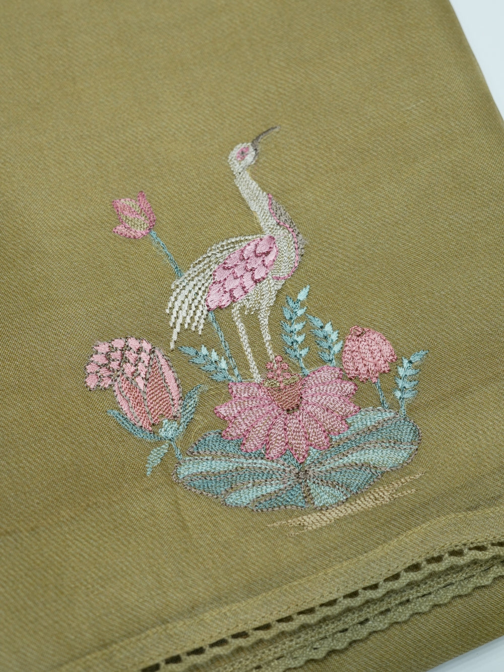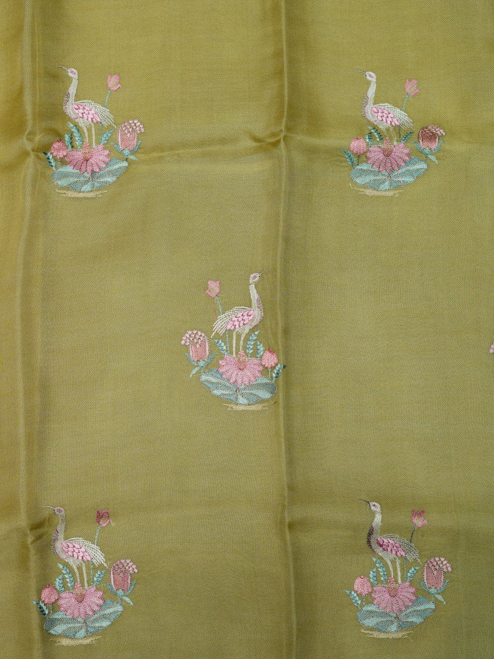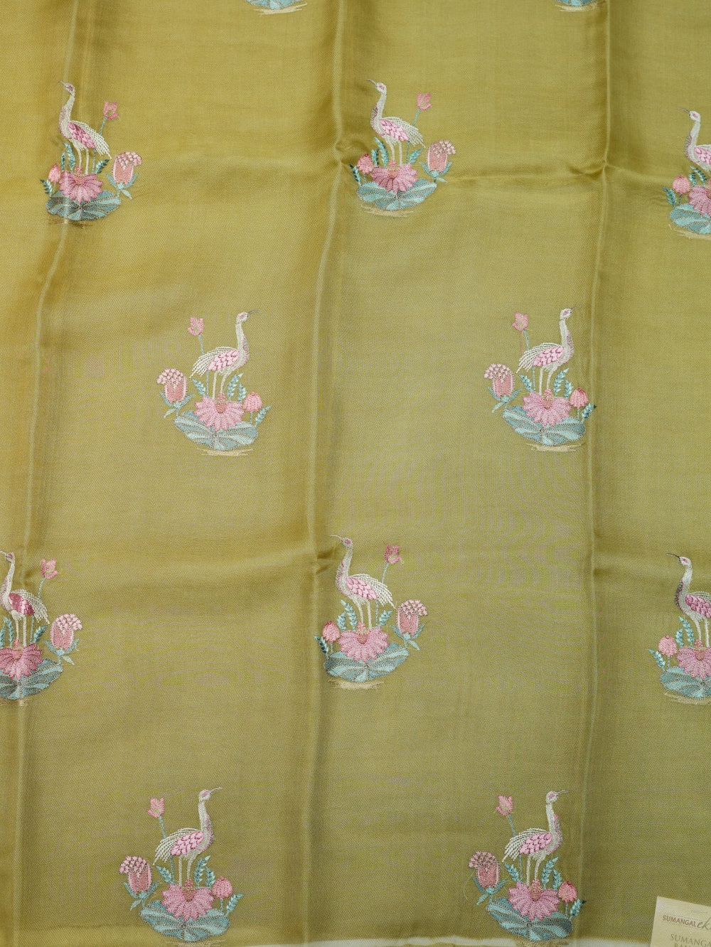 Soft and elegant, this Handwoven Golden Banarasi Organza Silk Suit reflects delicate craftsmanship and refined charm. The sheer organza top is beautifully adorned with all-over thread work embroidery, featuring graceful floral and bird motifs that add a handcrafted appeal. Complementing it is a finely woven dupatta with subtle zari weave, lending a gentle shimmer and balance to the ensemble. Lightweight and graceful, this suit is perfect for daytime festivities, intimate gatherings, and elegant celebrations, showcasing timeless Banarasi artistry.