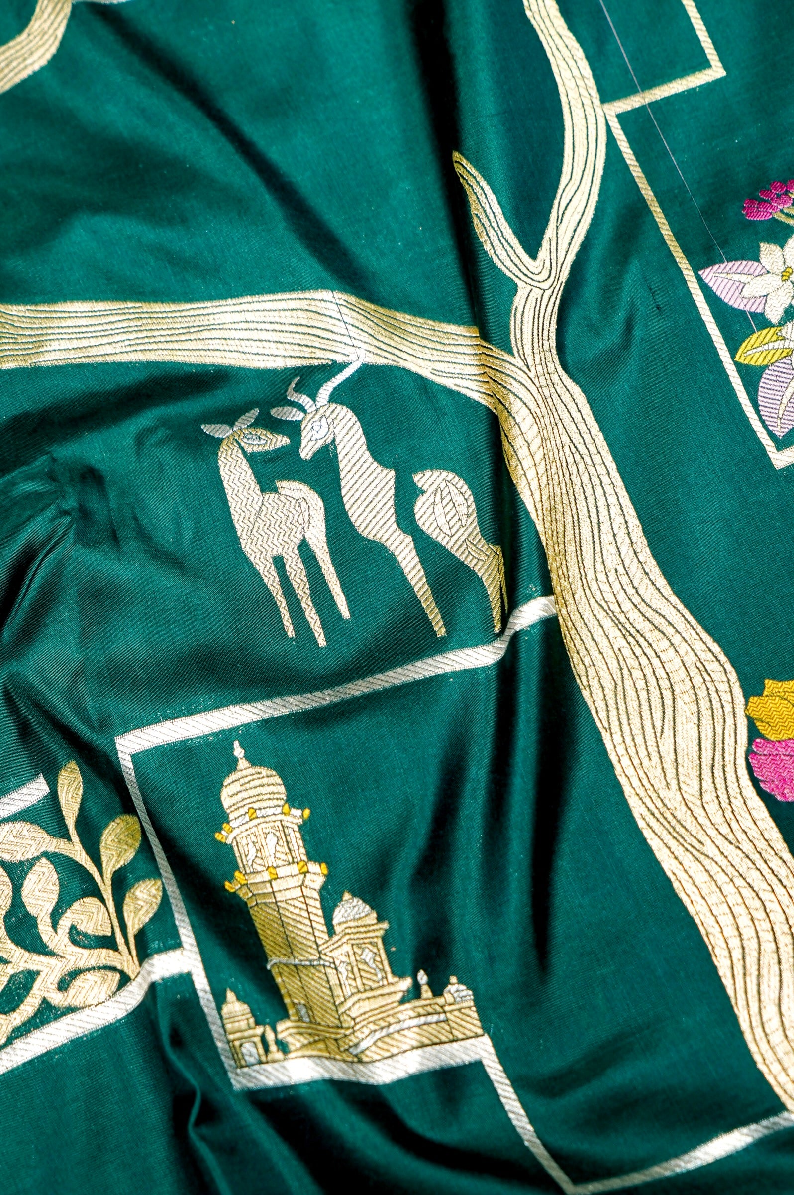 An artistic symphony of tradition and craftsmanship, this Handwoven Dark Green Meenakari Banarasi Katan Silk Saree showcases intricate Meenakari weaving with motifs of birds, deer, florals, and temple architecture. The enchanting zari vines in gold intertwine gracefully across the saree, creating a mesmerizing tapestry of nature-inspired beauty. Crafted using the Kadhwa technique, it reflects timeless Banarasi luxury. Paired with a self blouse, this saree embodies regal elegance — perfect for festive, bridal, or statement occasions.