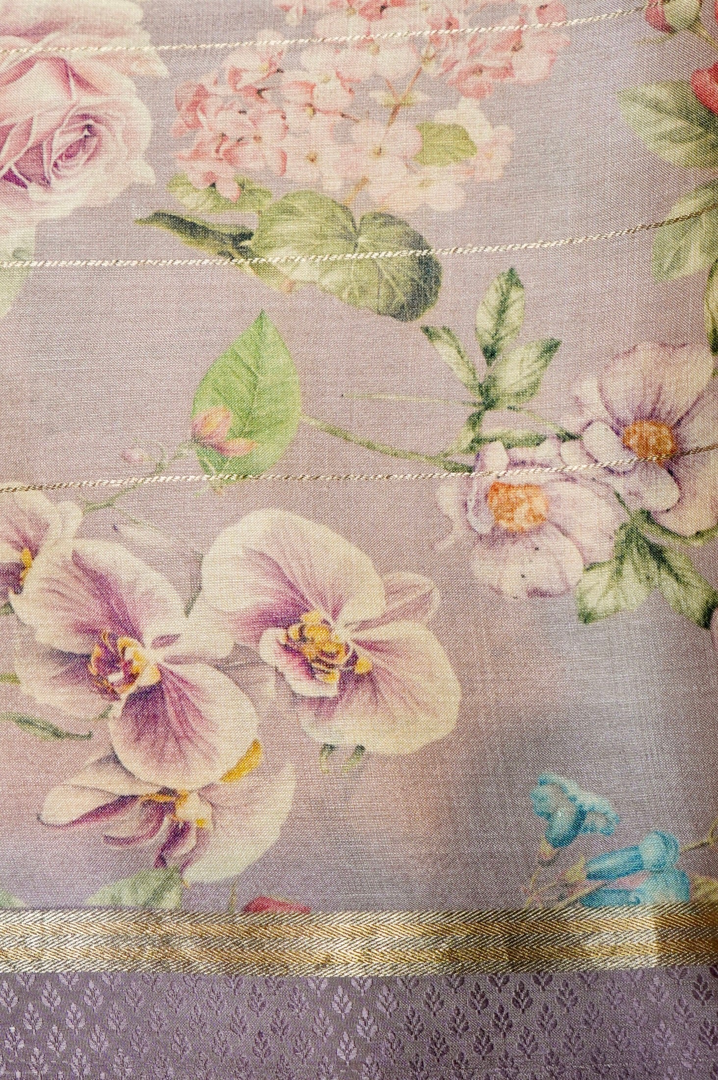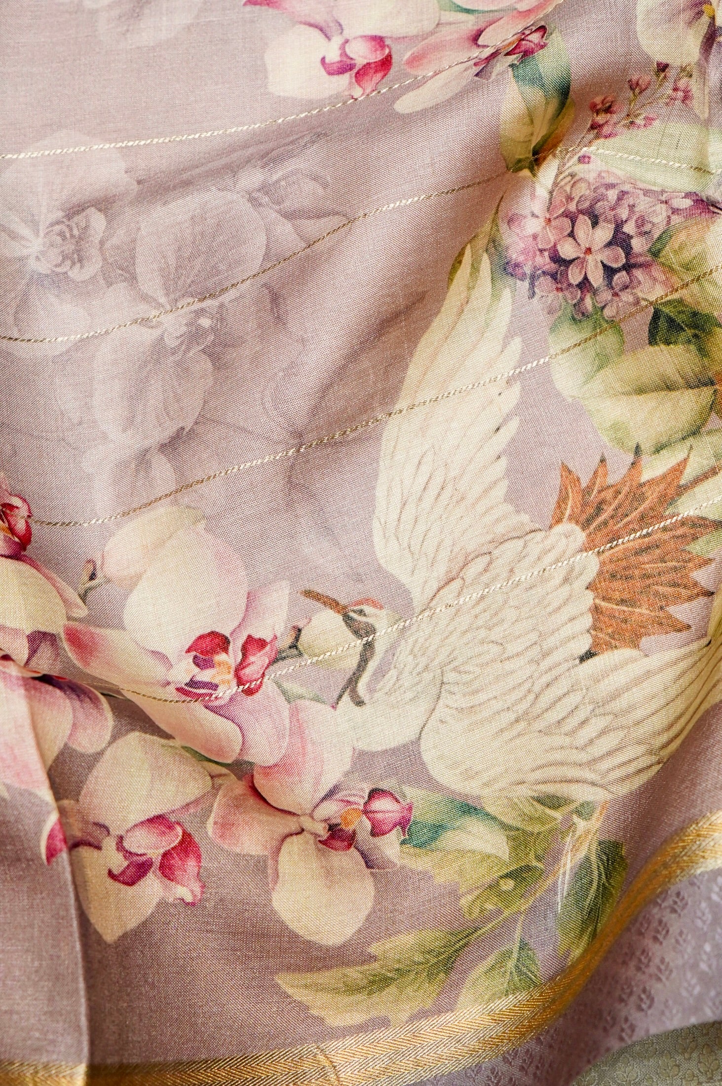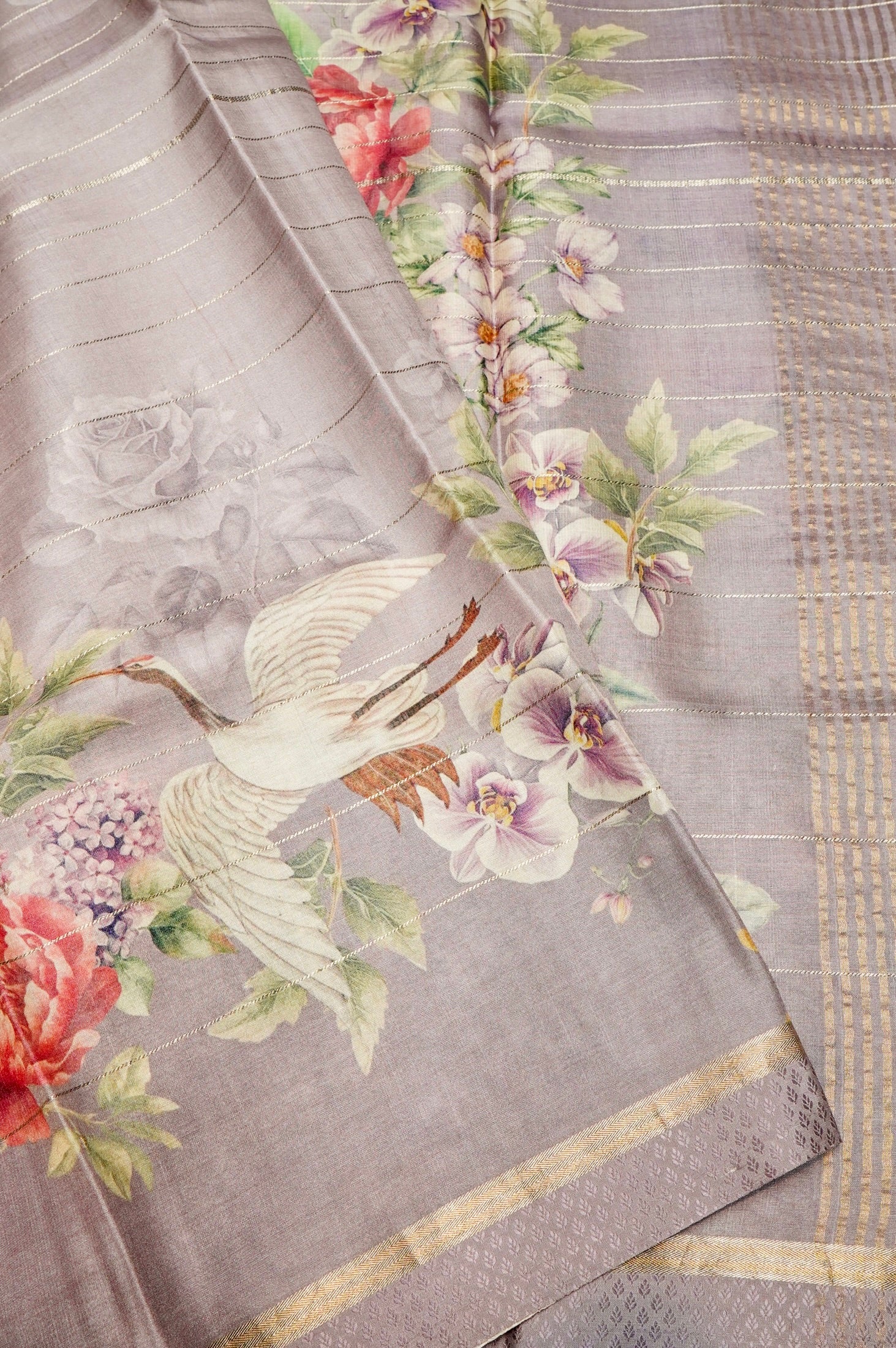 Embrace timeless elegance with this handwoven Grey Banarasi Soft Silk saree. The feather-light fabric features a striking all-over printed body with a captivating animal motif, bringing a sense of wild beauty to the traditional weave. The design is subtly enhanced with delicate zari weaving, adding a hint of sparkle that catches the light. Paired with a matching self-blouse, this piece is a perfect fusion of classic artistry and modern, understated sophistication.