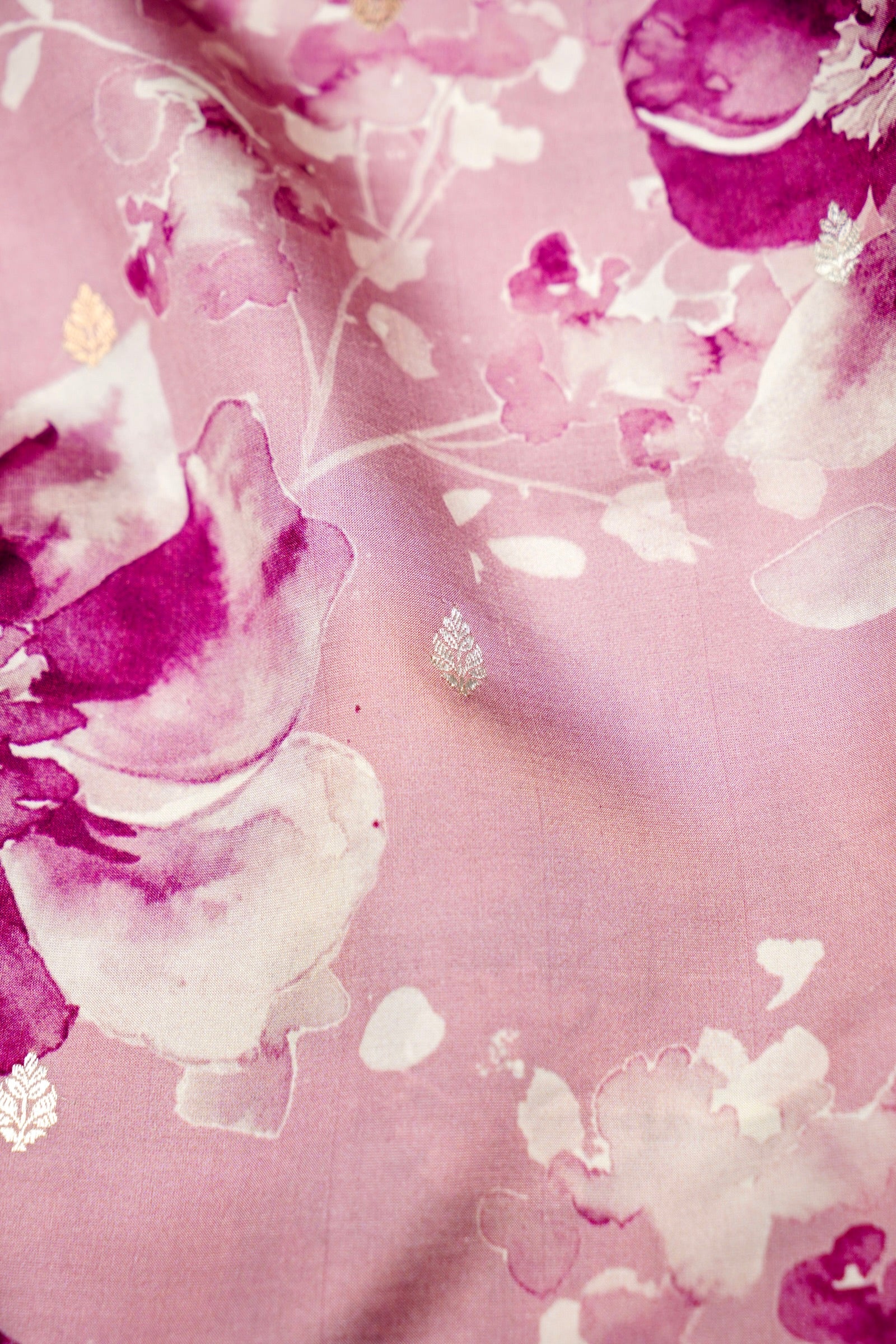 This elegant Handwoven Banarasi Katan Silk Saree in a soothing pink hue beautifully blends tradition with contemporary charm. The saree features exquisite floral digital prints across the body, highlighted with delicate zari elephant motifs along the border. A subtle golden zari pallu adds a touch of opulence, making it perfect for festive and formal occasions. Paired with a matching self blouse, this saree reflects refined grace and artistry — a timeless piece for every sophisticated wardrobe.
