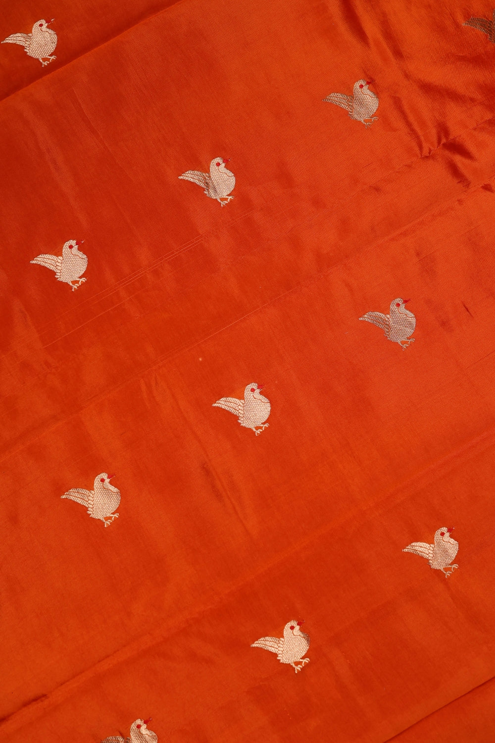 This handwoven Banarasi Katan Silk Suit in striking Vermilion Orange showcases the richness of traditional Banaras craftsmanship. Woven from pure katan silk, the fabric is adorned with delicate gold zari bird motifs, adding charm and elegance to its vibrant base. Orange continues to be a trending colour for festive wear, weddings, and religious occasions, symbolising joy, energy, and auspiciousness. The smooth silk texture, soft sheen, and minimal yet refined weaving make this suit a perfect choice for celebrations, daytime functions, and classic ethnic styling with a contemporary appeal.