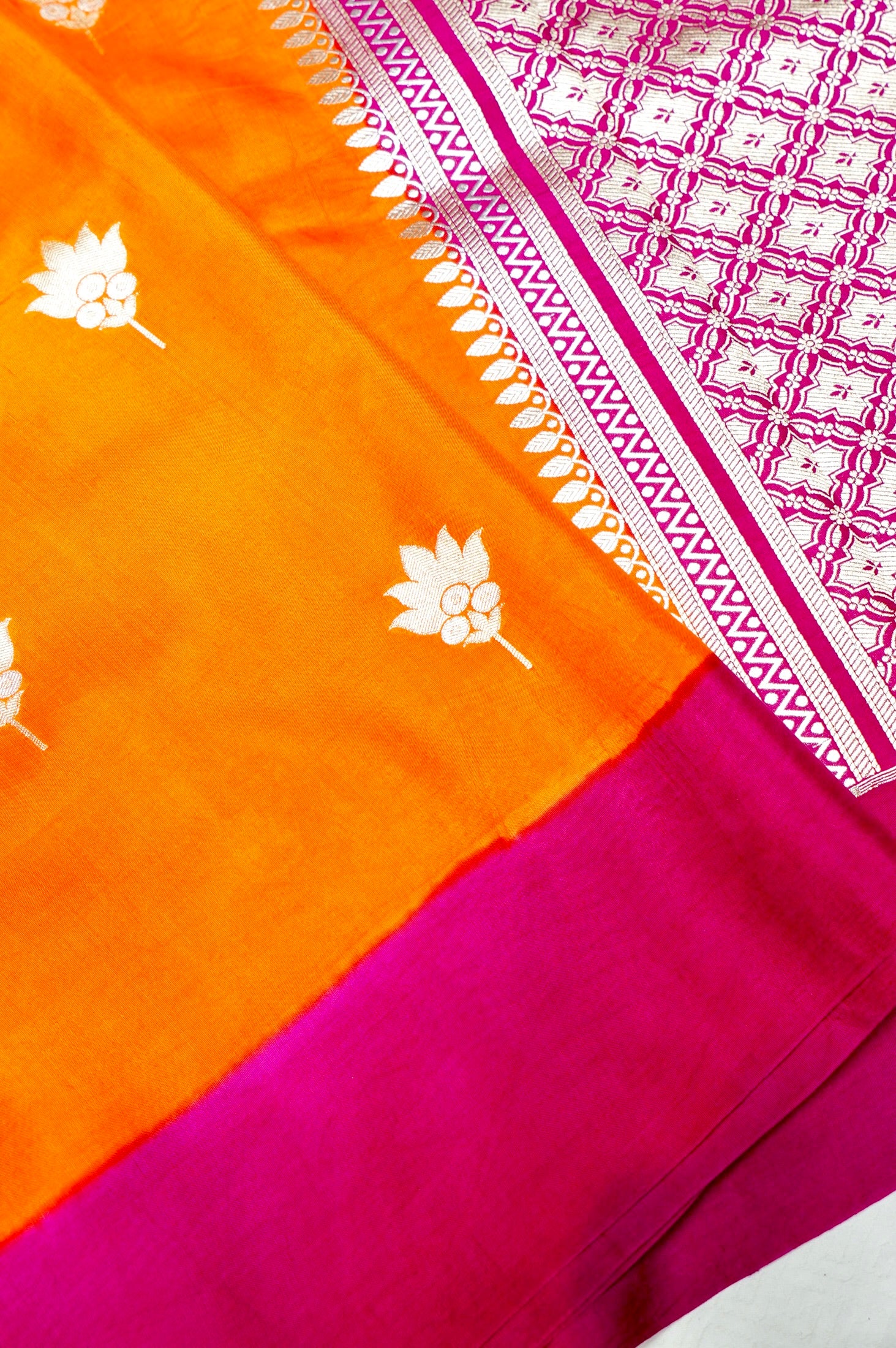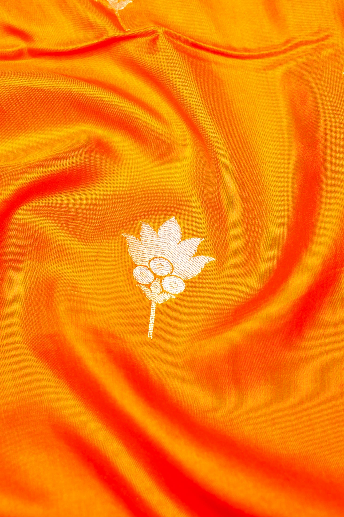 Celebrate vibrant elegance with this Handwoven Orange Banarasi Moonga Silk Saree, a stunning example of traditional craftsmanship. The luxurious Moonga silk fabric showcases a natural sheen and rich texture, allowing the bright orange hue to radiate festive charm. Intricately woven with fine Banarasi artistry, it drapes effortlessly, offering a graceful silhouette for weddings, festivals, or special occasions. Accompanied by an attached blouse piece, this saree combines heritage weaving with contemporary style, making it a timeless ensemble that exudes sophistication, vibrancy, and refined elegance.