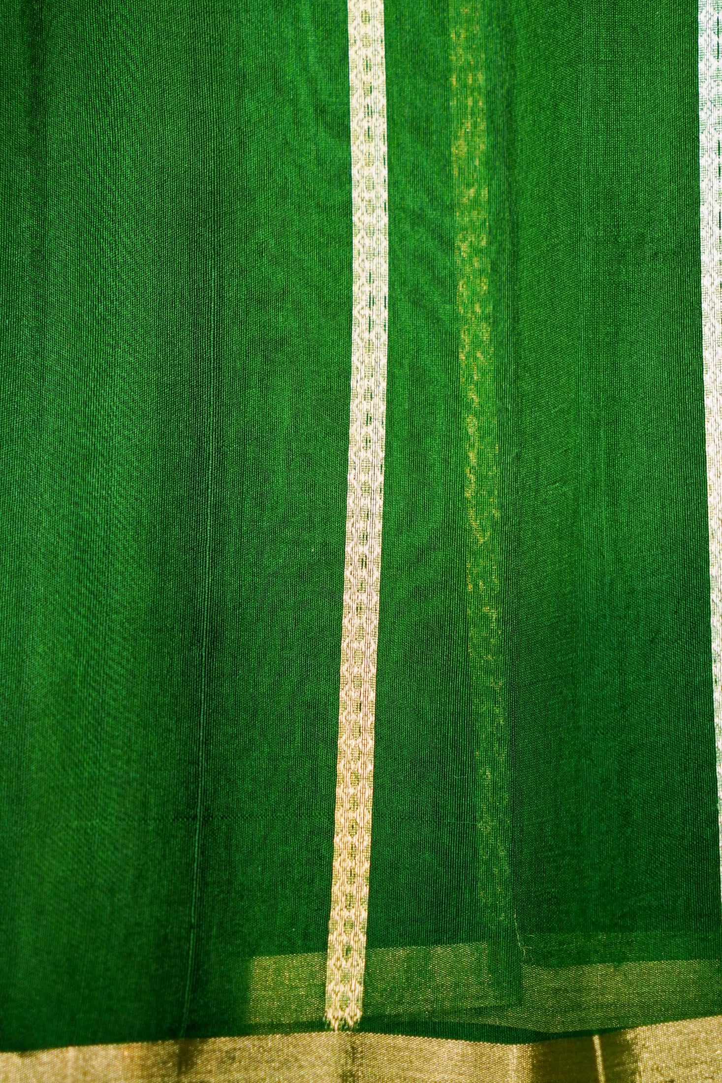 An ode to timeless craftsmanship, this exquisite parrot green Banarasi saree is a vision of ethereal elegance. Handwoven from delicate Organza, its body shimmers with intricate striped silver and gold zari work, creating a sophisticated play of light. The design is perfected with a rich zari woven border and pallu, adding a regal touch. Paired with a complementary self-blouse, this piece is a striking statement of refined luxury and traditional artistry, perfect for any celebratory occasion.