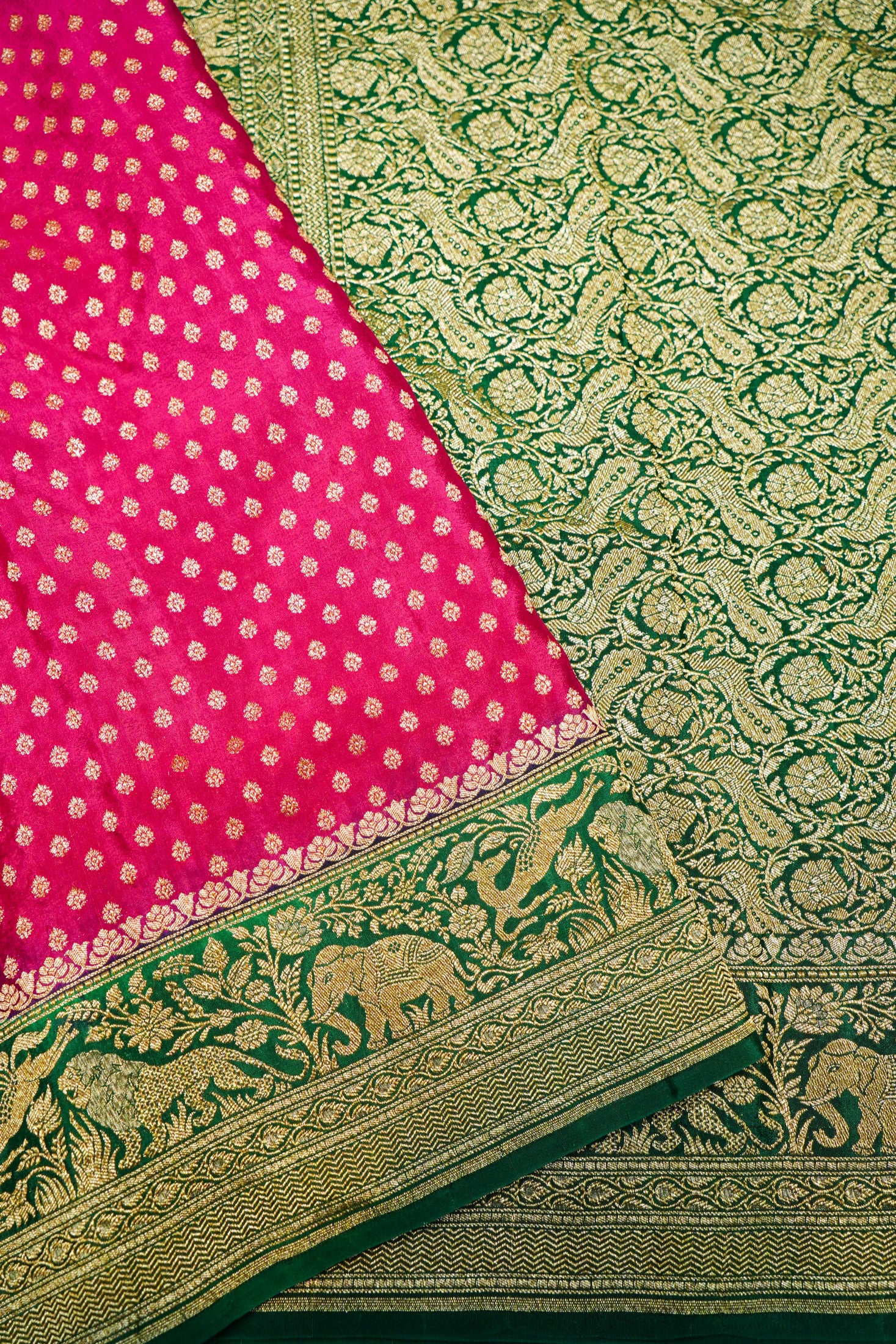 Embrace timeless elegance with this Handwoven Pink Banarasi Crepe Khaddi Saree, featuring a rich pink body adorned with delicate zari buti motifs. The smooth crepe texture lends a graceful fall, enhancing its luxurious appeal. A contrasting green border and pallu intricately woven in fine Banarasi craftsmanship add a vibrant touch of tradition and sophistication. Perfect for festive occasions, weddings, and celebrations, this saree comes with an attached blouse piece, offering a perfect balance of classic charm and contemporary grace in every drape.