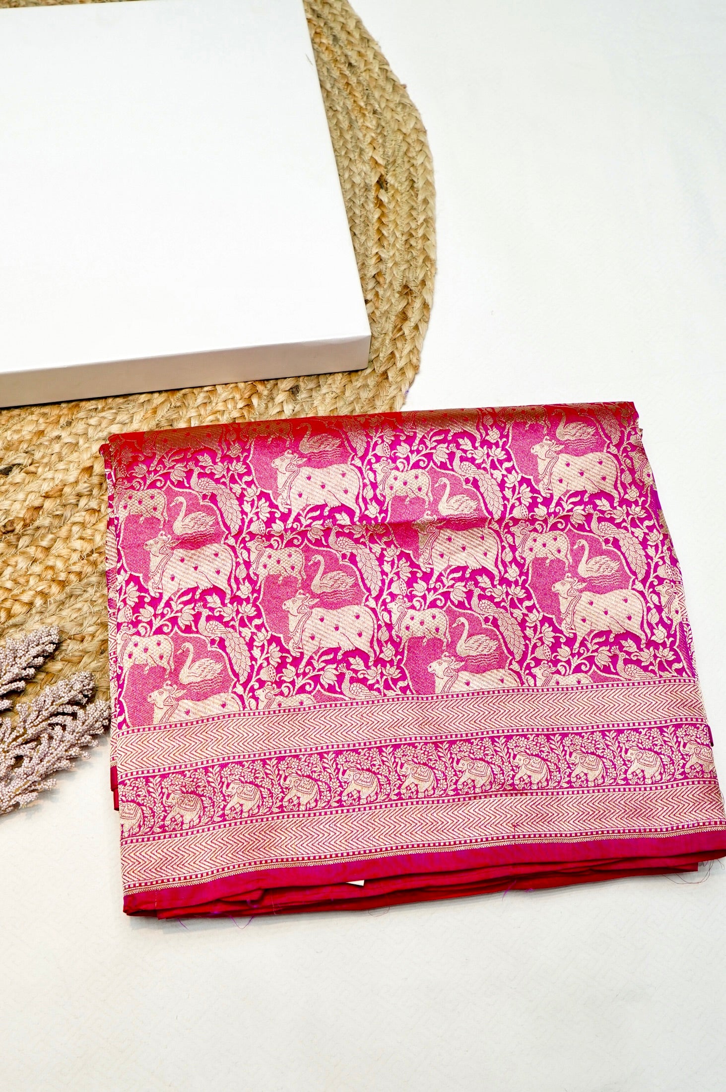 An artistic expression of Banaras’ royal legacy, this Handwoven Pink Banarasi Katan Silk Saree showcases exquisite Shikargah motifs — depicting graceful animals and birds woven in lustrous zari. The vibrant pink hue enhances its grandeur, while the intricately detailed border adds a regal touch to the drape. Crafted in pure Katan silk, this saree is a timeless ode to traditional weaving and luxury craftsmanship. It comes with a matching blouse piece, making it perfect for festive and wedding occasions.
