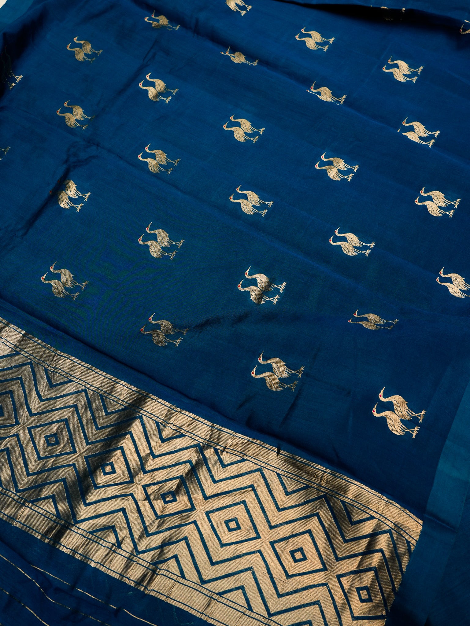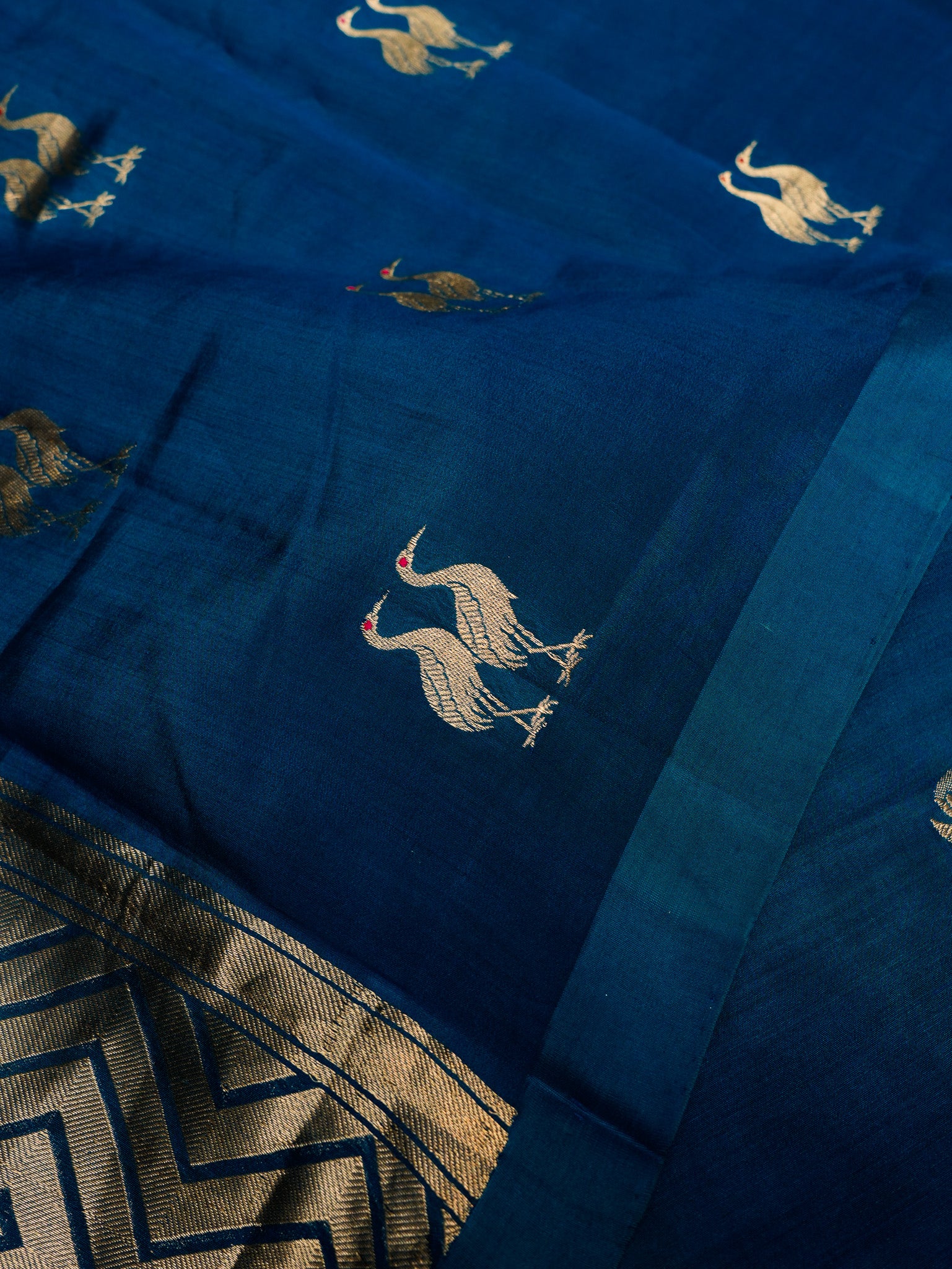 A rich teal blue Banarasi Katan silk suit featuring elegant crane (hans) motifs woven across the fabric in fine gold zari, symbolising grace and prosperity. The smooth silk base is further enhanced with subtle floral meenakari detailing, adding depth and colour without overpowering the look. Paired with a coordinated dupatta adorned with geometric san-pattern zari weaving, the ensemble balances tradition and refinement beautifully. Ideal for festive wear, cultural occasions, and evening celebrations, the design reflects classic Banarasi artistry with a calm, sophisticated appeal.