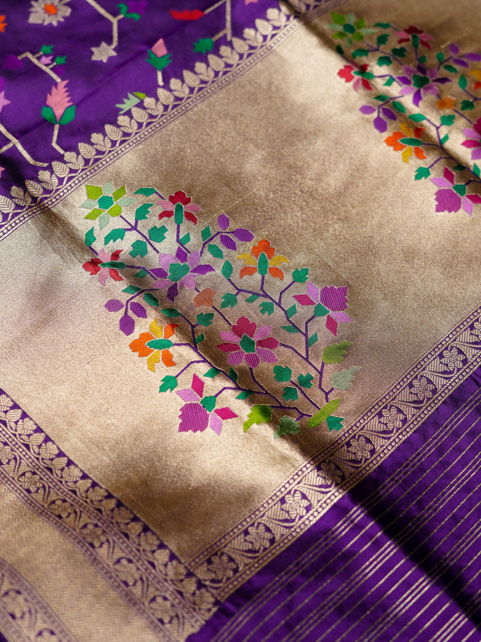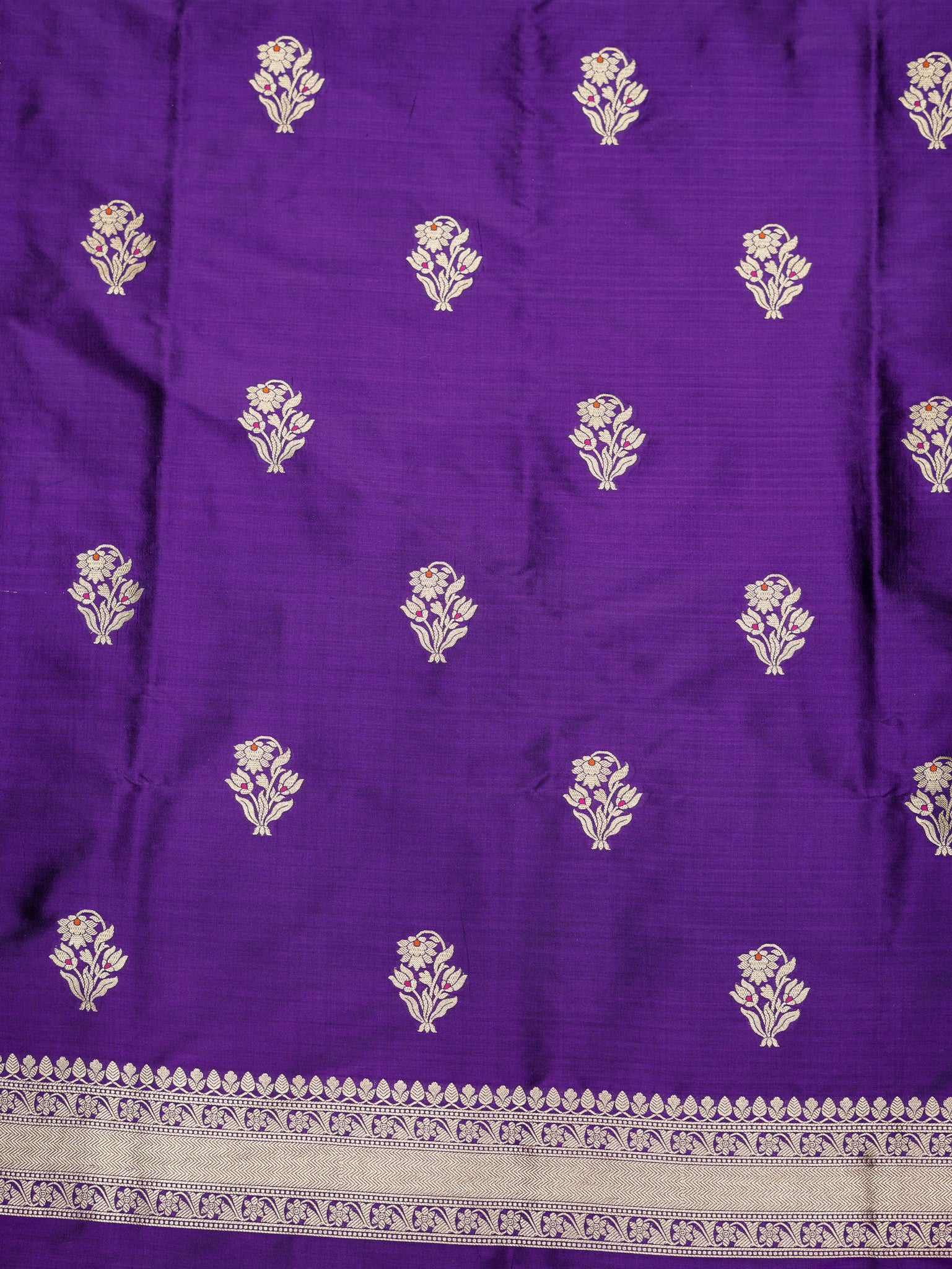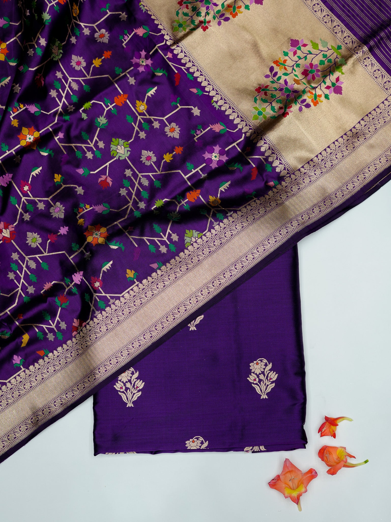 A rich purple Banarasi Katan silk suit featuring an elegant spread of floral meenakari motifs inspired by traditional vine patterns. Fine multicolour detailing brings depth and vibrancy to the silk surface, while the natural sheen of Katan enhances its graceful fall. The ensemble is paired with a matching dupatta adorned with coordinated meenakari accents and classic Banarasi borders, creating a harmonious look. Ideal for festive celebrations and refined occasions, the suit reflects skilled handloom artistry blended with timeless colour appeal.
