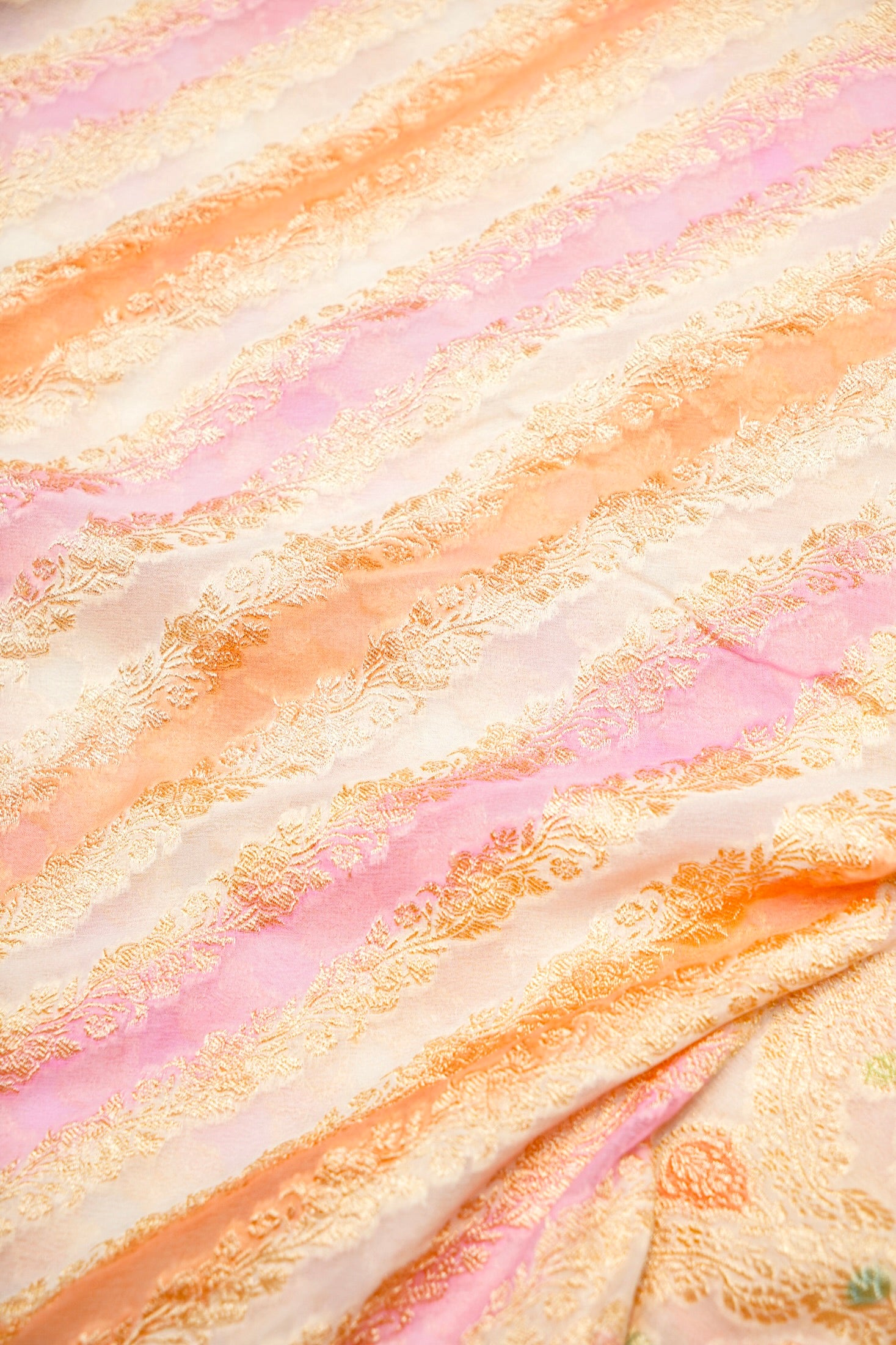 Grace your special occasions with this Handwoven Cream-Pink Hue Rangkat Banarasi Khaddi Georgette Saree, a stunning blend of tradition and elegance. The saree features beautifully woven diagonal Rangkat patterns that create a soft interplay of cream and pink tones, exuding sophistication and charm. Crafted from lightweight Khaddi Georgette, it drapes gracefully while reflecting the finesse of Banarasi weaving. Perfect for festive celebrations or weddings, this saree comes with an attached blouse piece, offering a complete ensemble that radiates subtle luxury and timeless appeal.