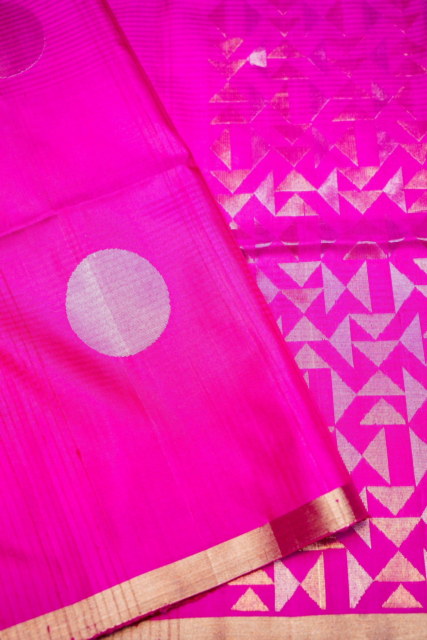 Drench yourself in the vibrant glow of this handwoven Rani Pink Banarasi Soft Silk saree. The exquisite fabric offers a luxurious, fluid feel, gracefully adorned with a sophisticated all-over polka dot weave that adds playful dimension. This charming pattern is anchored by a stunningly intricate geometrical weave pallu, which showcases the master craftsmanship of Banaras. Completed with a coordinating self-blouse, this piece is an heirloom of bold colour and truly sophisticated, contemporary elegance.