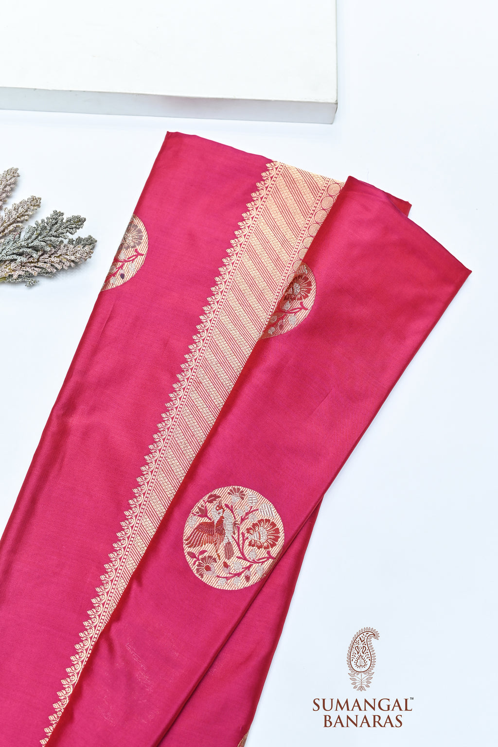 Handwoven in Banaras, this Rani Pink Meenakari Banarasi Katan Silk Saree reflects refined craftsmanship and timeless elegance. The lustrous katan silk base is adorned with intricate golden zari bird motifs highlighted with delicate meenakari detailing. A richly woven kadhwa pallu and coordinated border add depth, texture, and ceremonial charm. Smooth drape, graceful sheen, and artisanal precision make it ideal for weddings, festive evenings, and heirloom wardrobes. Comes with a matching self blouse for a complete, polished ensemble, crafted to celebrate Indian textile heritage with pride.