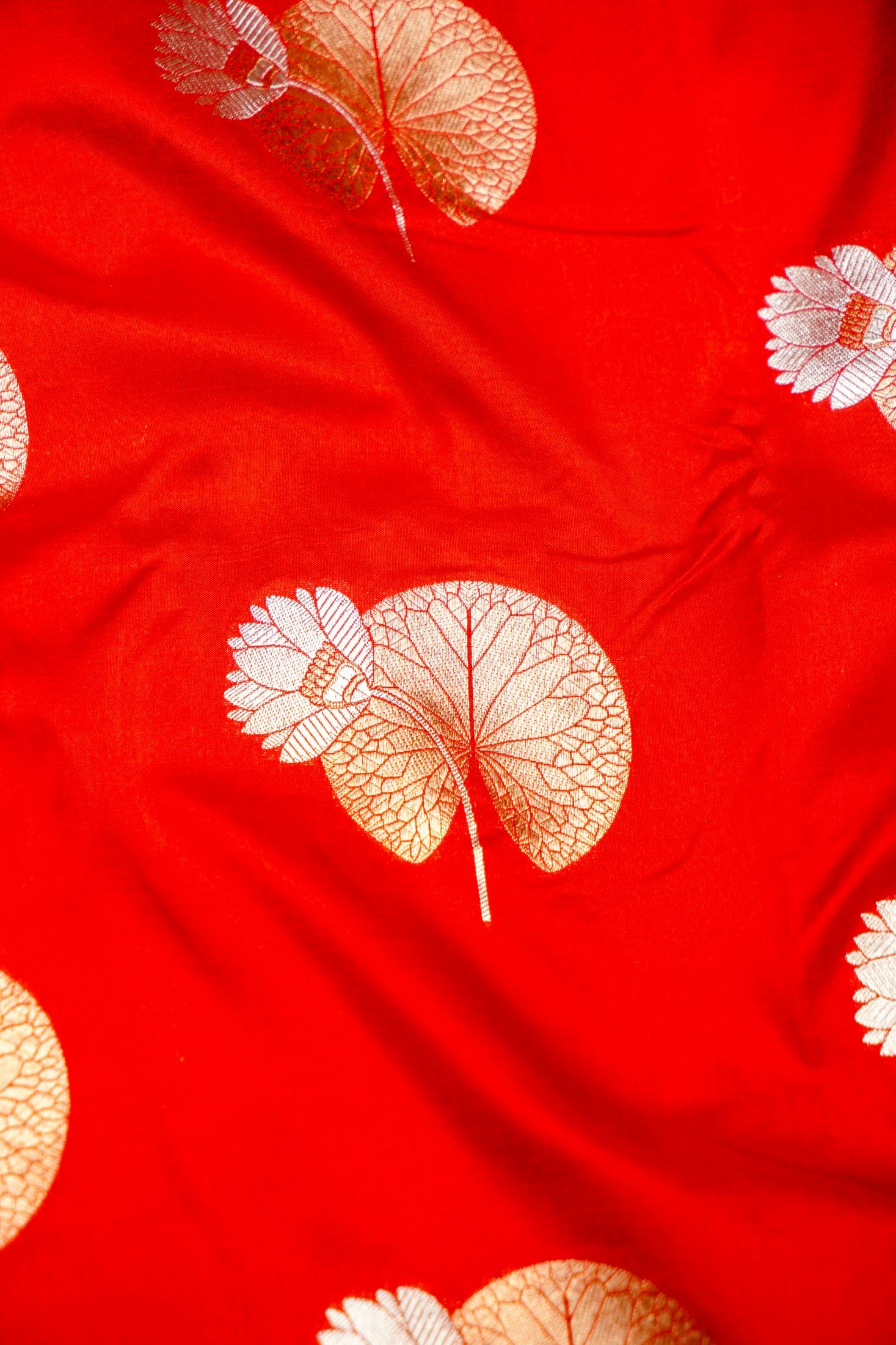 Ignite your style with this striking handwoven Red Banarasi Katan Silk saree. The luxurious fabric is a canvas for magnificent artistry, featuring an intricate all-over lotus weave that blooms across the entire body, symbolising purity and grace. The saree achieves stunning contrast with a vibrant pink border that frames the rich weaving pallu. Paired with a matching self-blouse also finished with the same contrast pink border, this piece is a masterpiece of festive elegance.