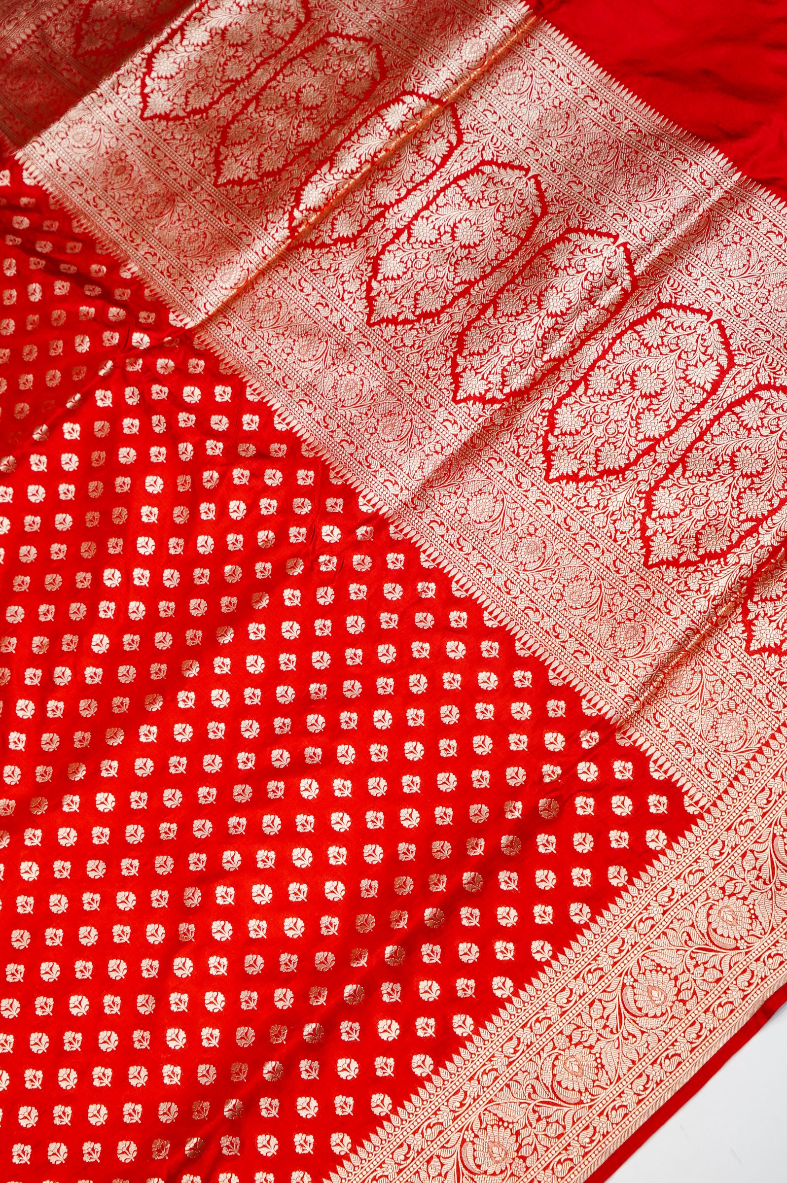 The Handwoven Red Kadhwa Banarasi Katan Silk Saree is a magnificent ode to Banaras’ royal weaving legacy. Crafted from pure Katan silk, it showcases exquisite Kadhwa butis woven in fine gold zari that shimmer beautifully against the rich red canvas. The intricate floral jaal and grand paisley motifs on the pallu exude timeless grace and luxury. Paired with a matching self-blouse, this saree radiates classic bridal charm—perfect for weddings, festive occasions, and grand celebrations. A true masterpiece that captures heritage, elegance, and opulence in every weave.