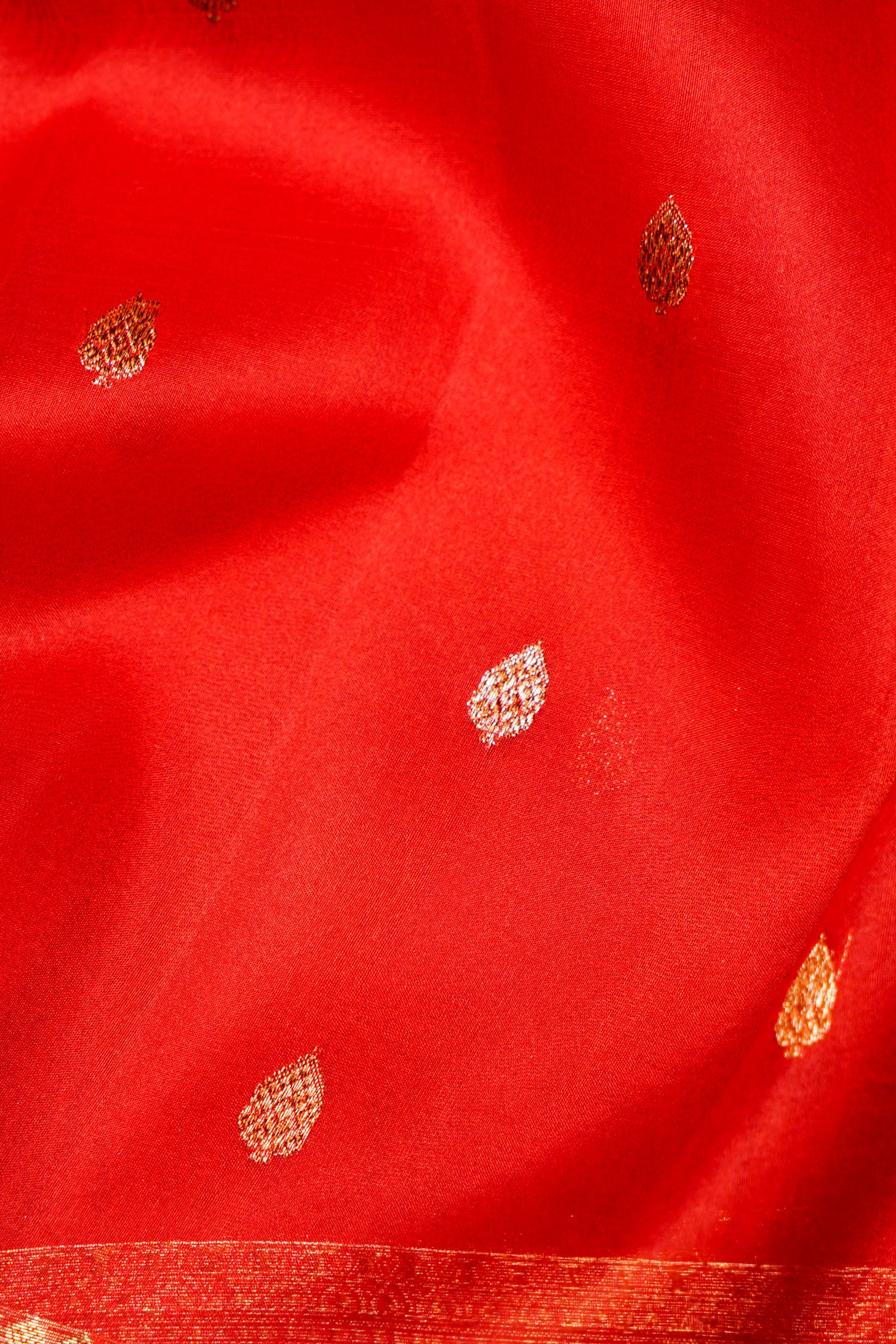 A masterpiece of tradition and artistry, this handwoven Banarasi saree is a radiant treasure. Crafted from fine red organza, its sheer body is a canvas for intricate all-over zari booti motifs that shimmer with every step. The exquisite detailing continues with a rich zari woven border and pallu, framing the saree with opulent elegance. Paired with a matching self-blouse, this piece embodies a timeless beauty that is both classic and captivating. It’s a celebration of heritage, designed to make you feel truly special.