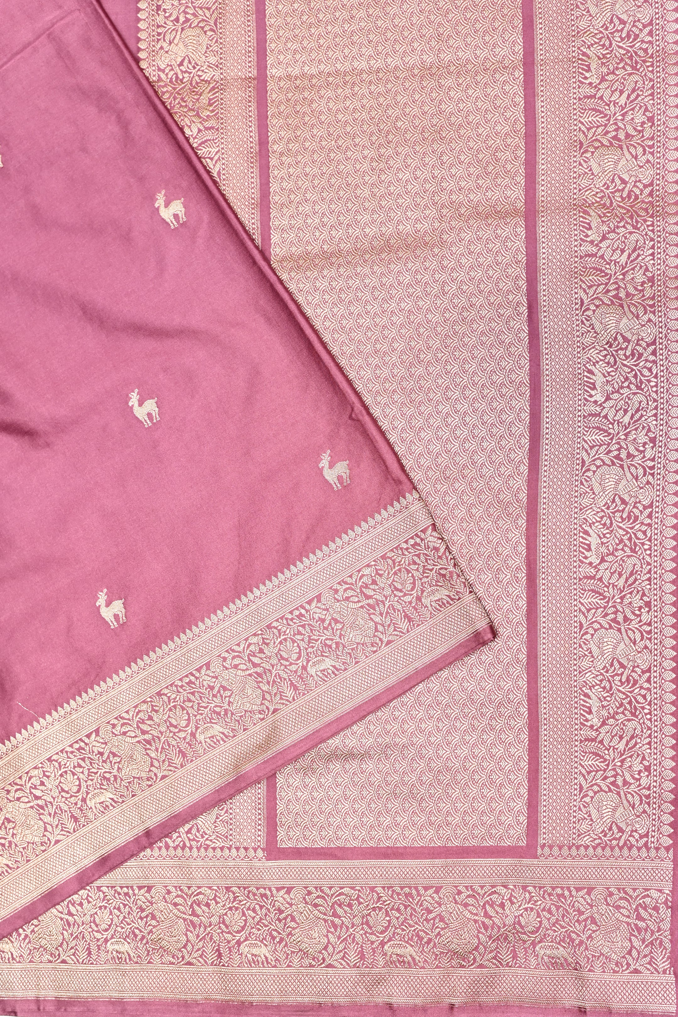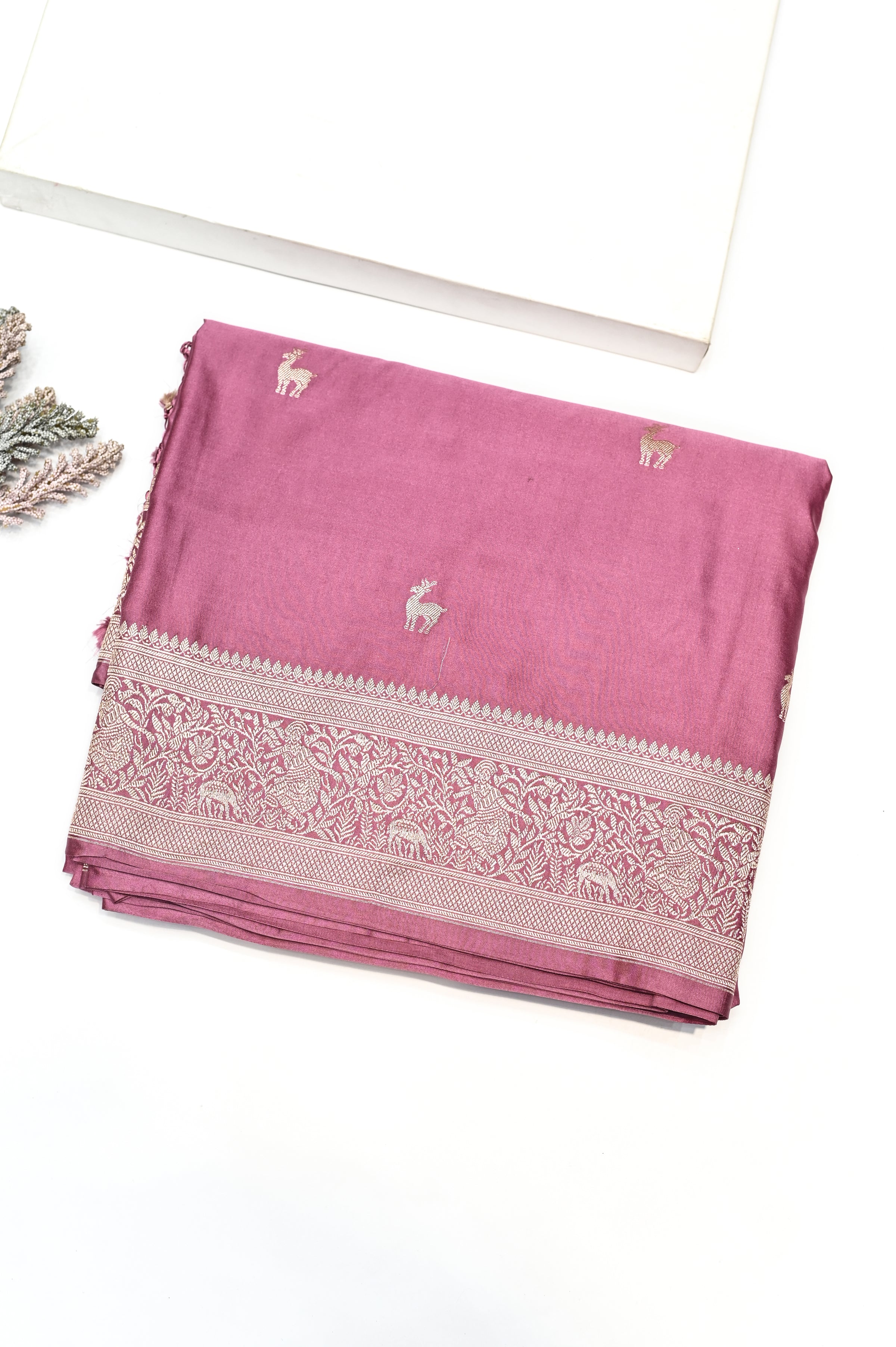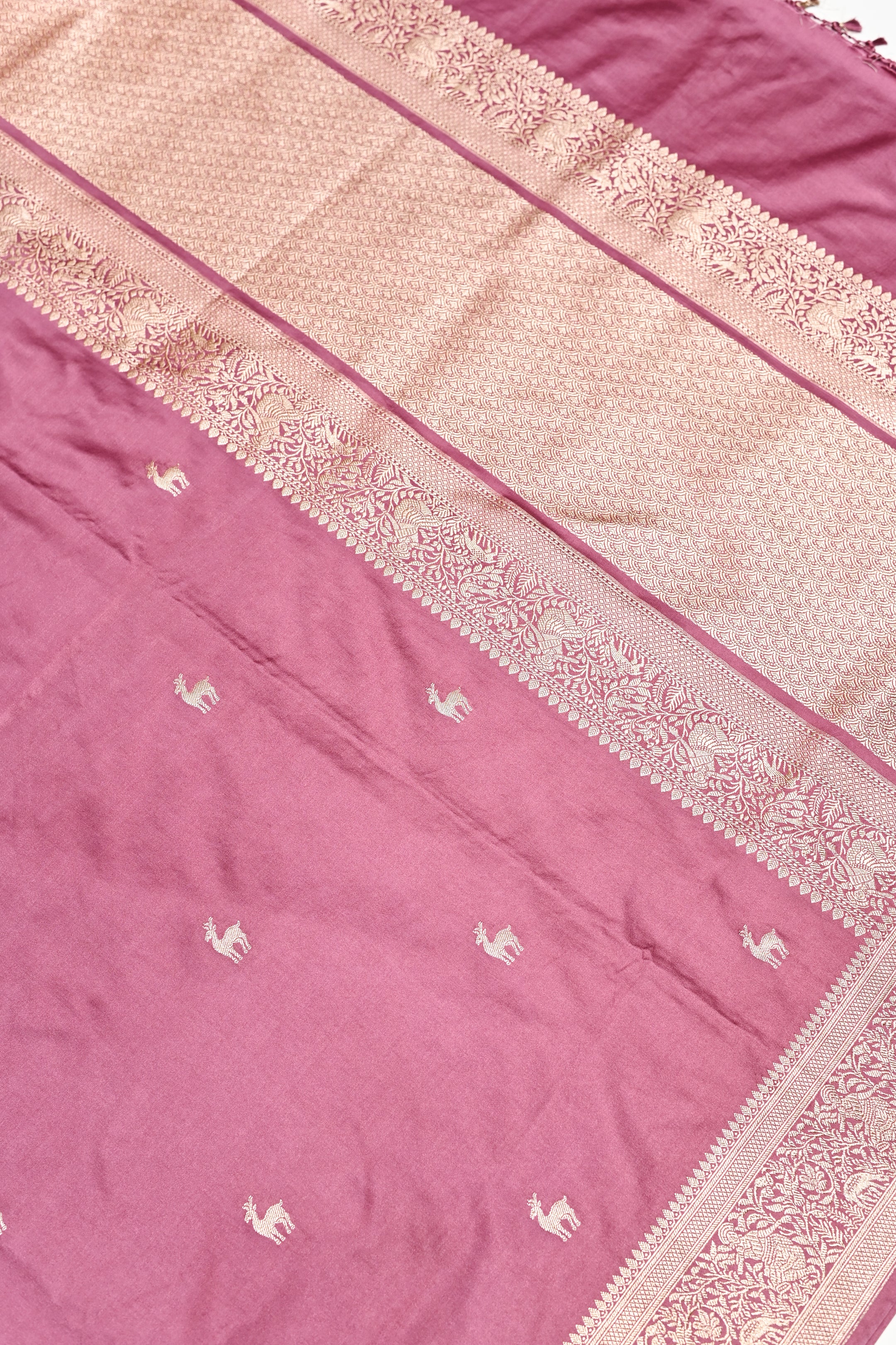 Indulge in refined tradition with this Handwoven Rosewood Pink Banarasi Moonga Silk Saree, beautifully crafted by skilled weavers of Banaras. Made from premium moonga silk, it is lightweight, breathable, and known for its smooth texture and gentle sheen. The rich rosewood pink tone adds depth and elegance, while classic woven motifs and a finely detailed border enhance its timeless appeal. Perfect for festive occasions, weddings, and cultural celebrations, this saree offers a graceful drape and lasting comfort — a sophisticated addition to your ethnic collection.
