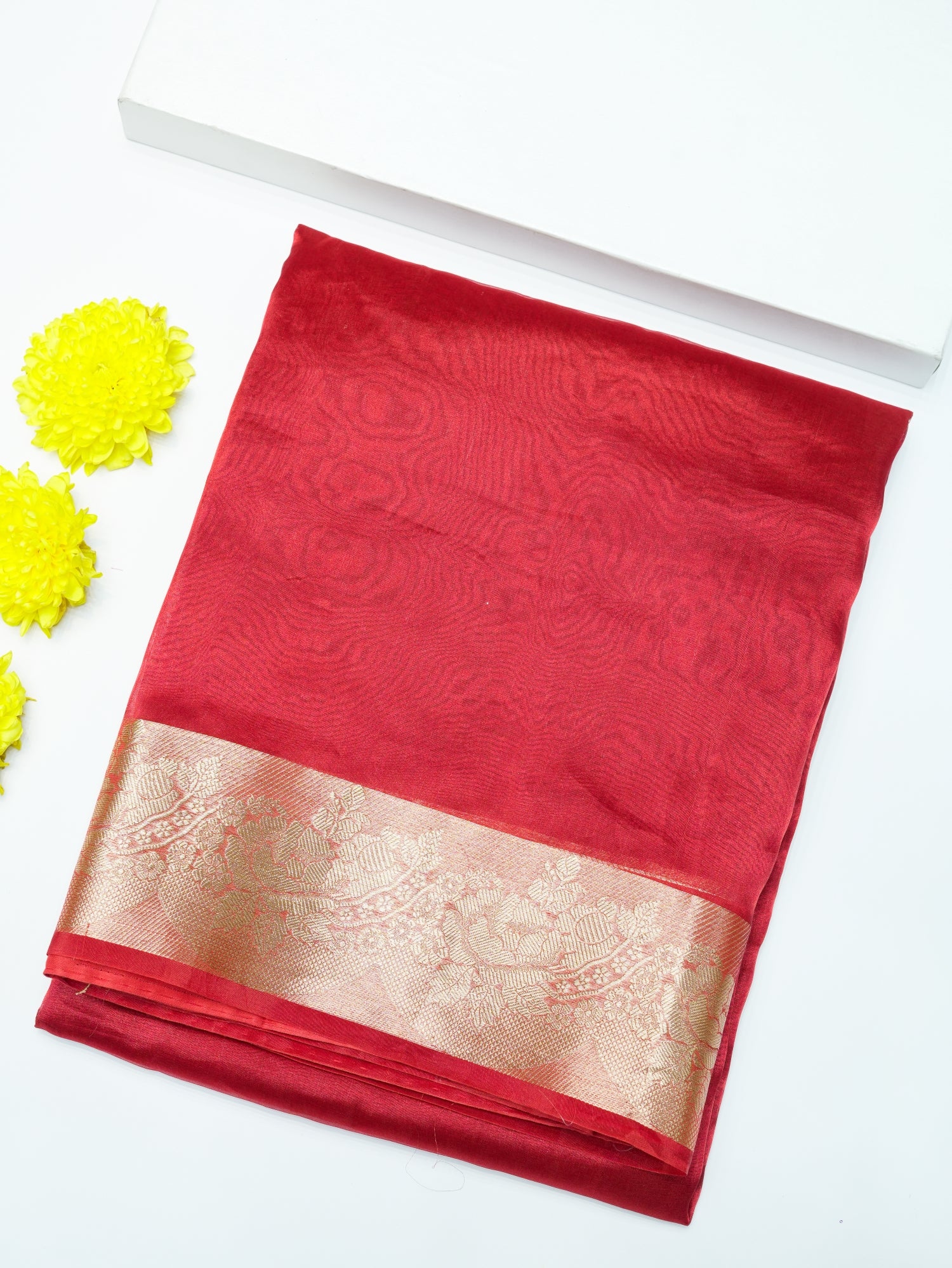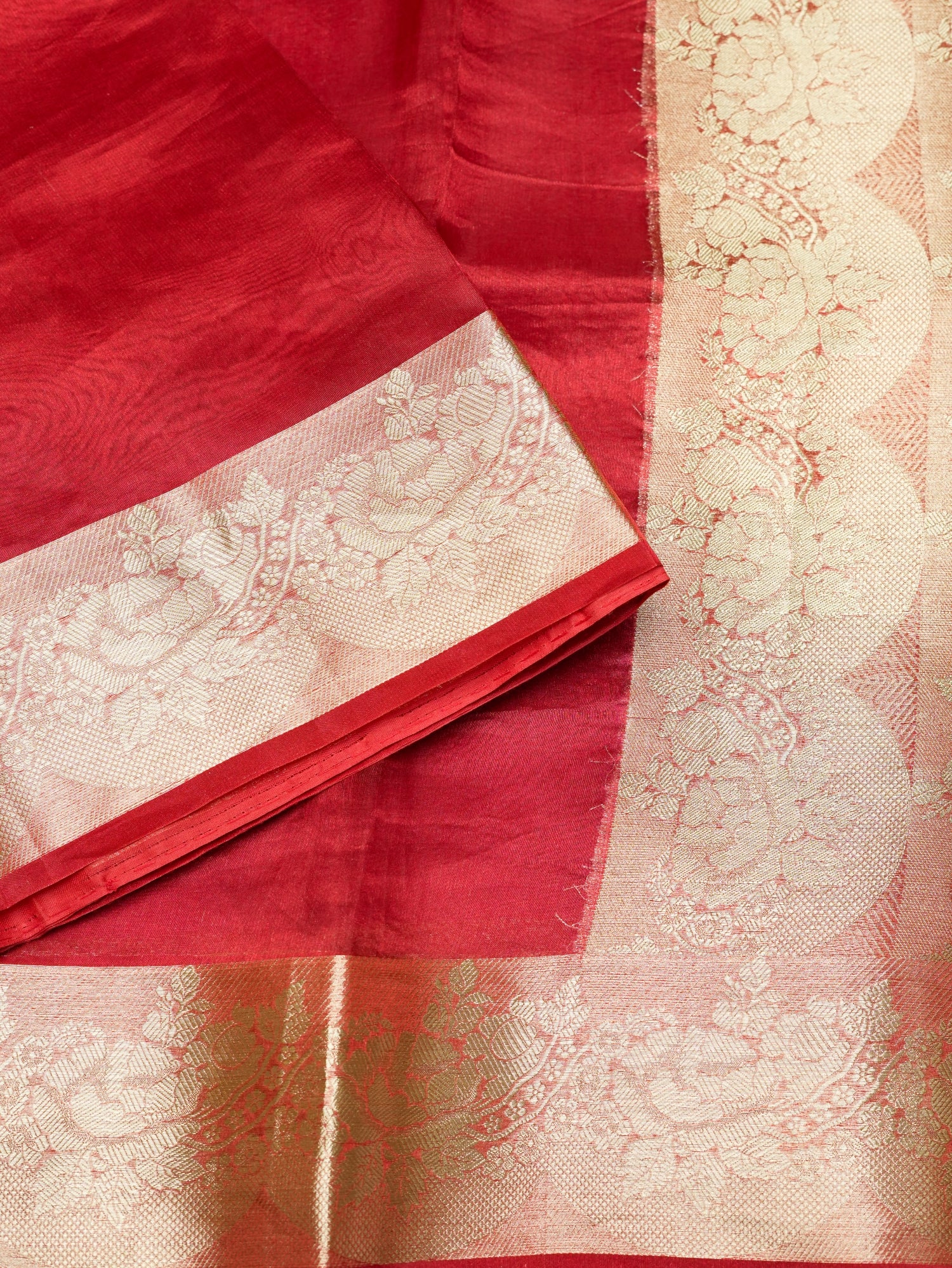 Drape yourself in timeless elegance with this Handwoven Red Banarasi Tissue Silk Saree, crafted by skilled artisans using fine silk and zari. The rich red body is complemented by a luminous golden tissue pallu, intricately woven with traditional floral motifs that reflect classic Banarasi artistry. Lightweight yet regal, the tissue silk offers a graceful, crisp drape with a subtle metallic sheen. Perfect for weddings, festive celebrations, and special occasions, this saree embodies heritage craftsmanship and refined luxury.