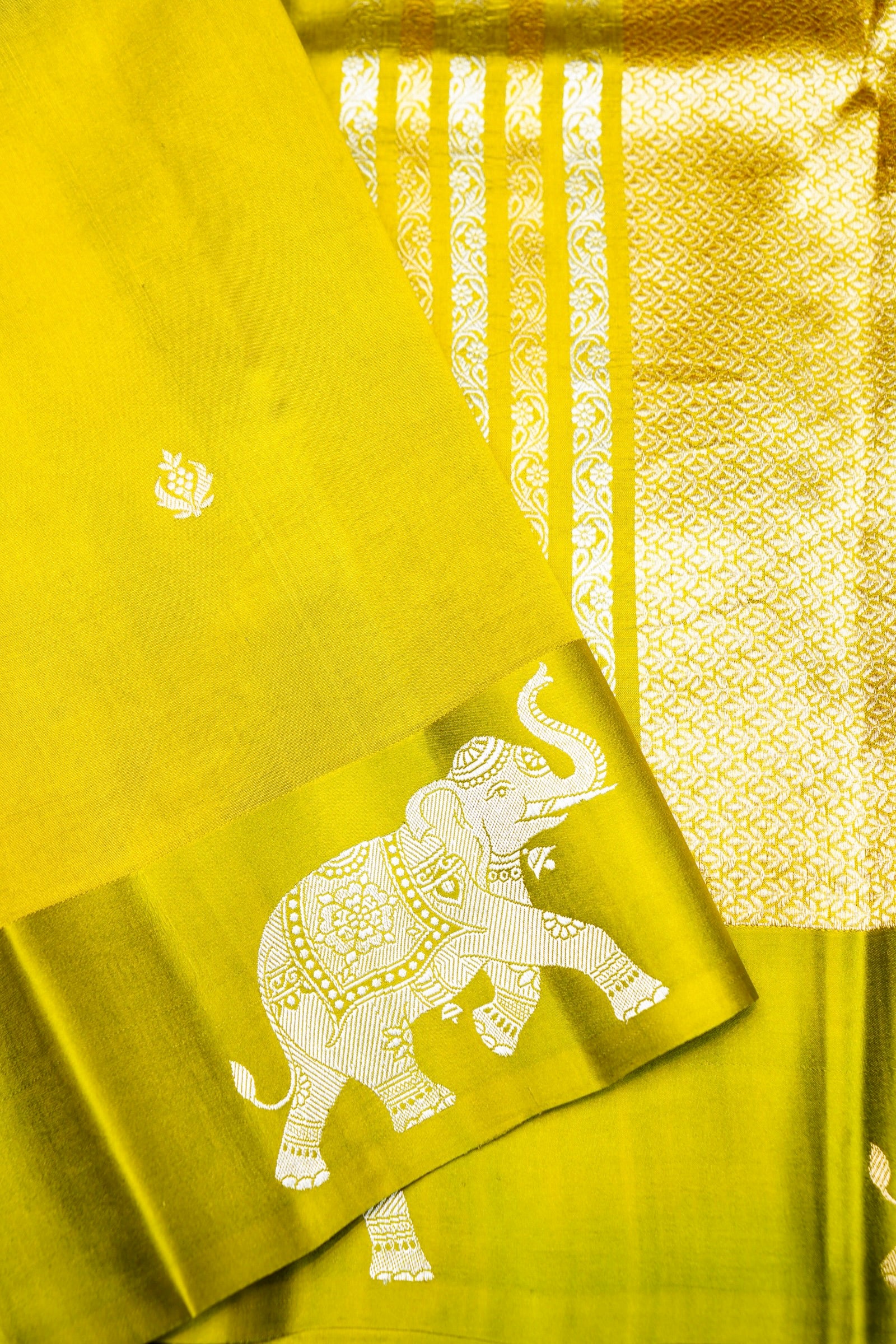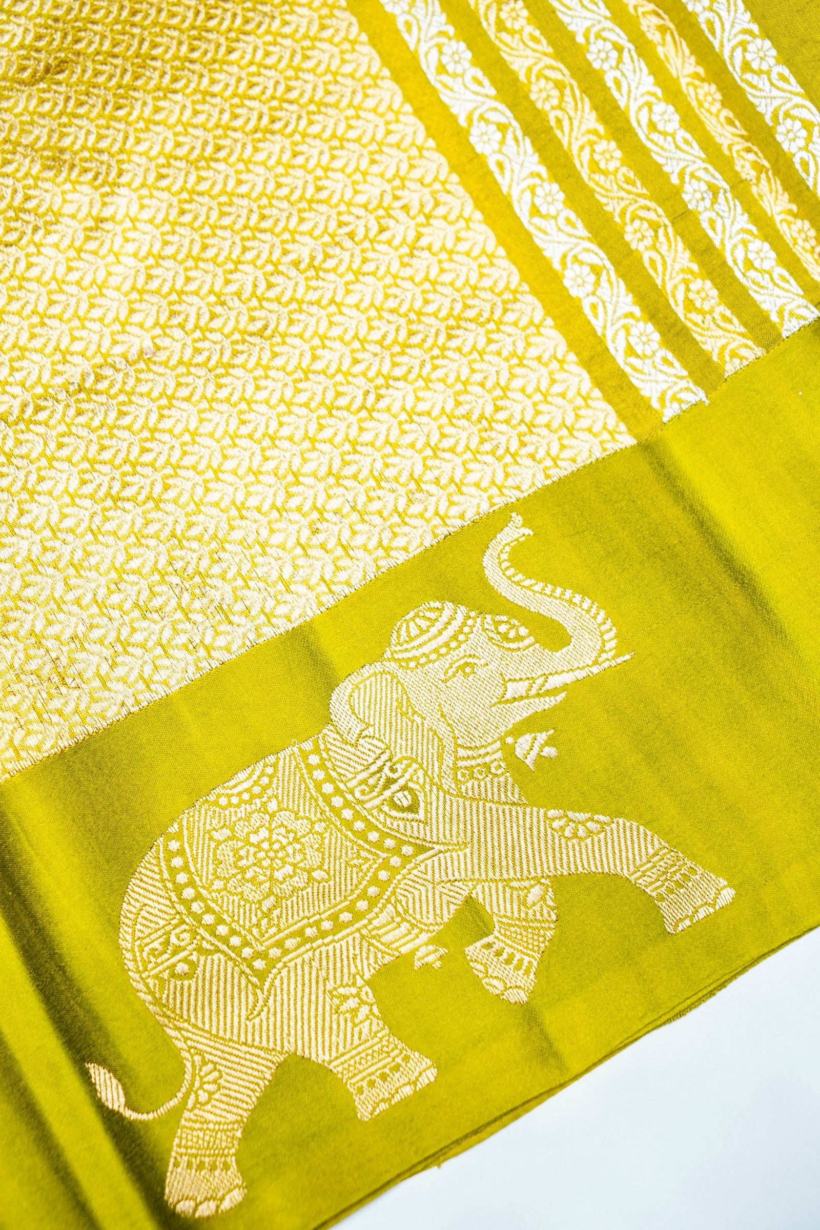 This Handwoven Banarasi Katan Silk Saree features a rich mustard yellow base that radiates warmth and elegance, beautifully highlighted with delicate silver zari butis and a traditional elephant motif on the pallu. The pure Katan silk offers a smooth texture, natural sheen, and graceful drape, reflecting the finesse of classic Banarasi handloom craftsmanship. Expertly handwoven by skilled artisans, this saree is perfect for festive celebrations, weddings, and cultural occasions, blending timeless heritage with vibrant sophistication.