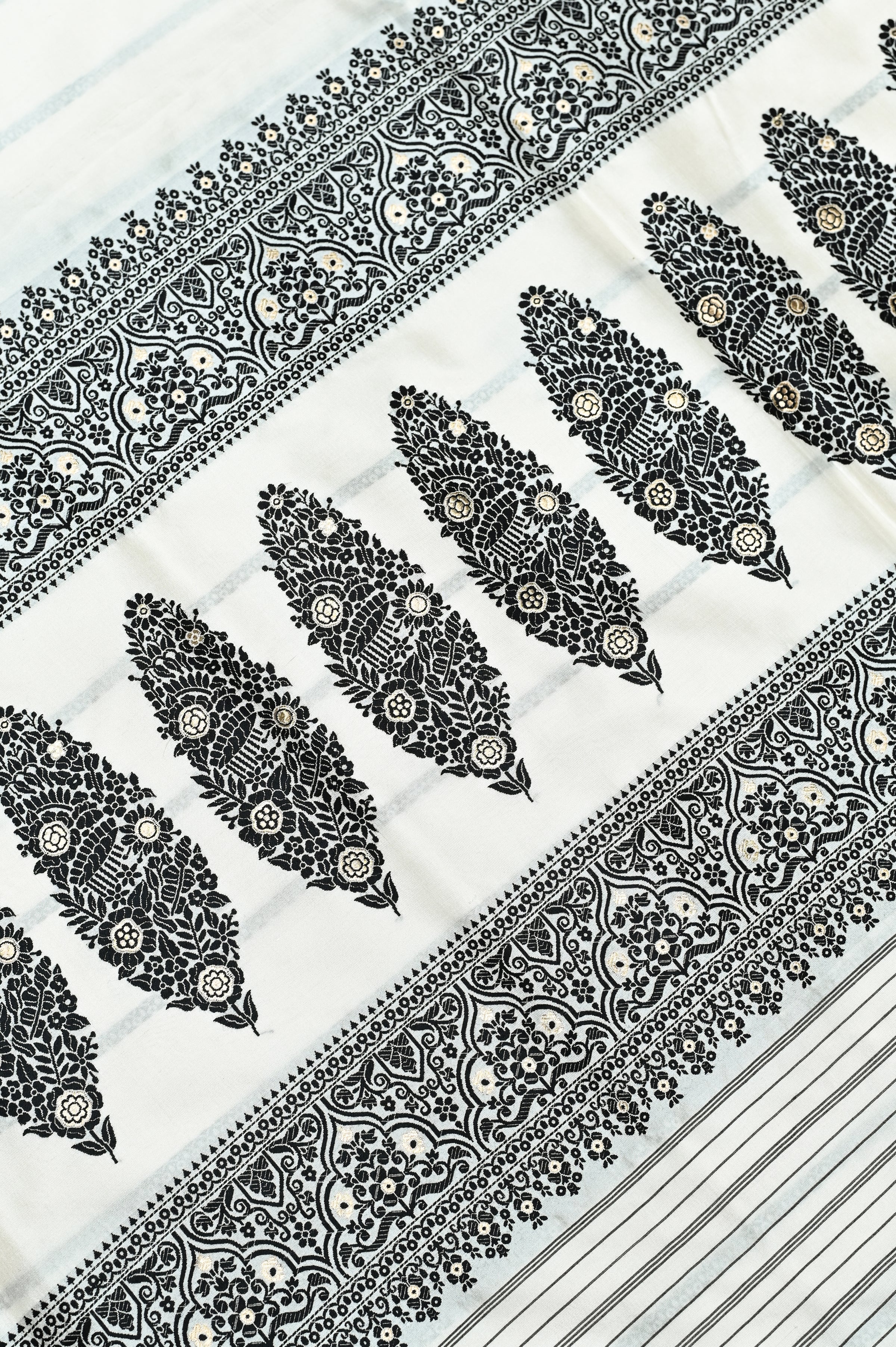 Handwoven in Banaras, this elegant white Banarasi Katan silk saree showcases refined craftsmanship with an all-over resham weave across the body, border, and pallu. The subtle patterns create a graceful balance of simplicity and tradition, making it ideal for daytime weddings, festive gatherings, and formal occasions. The smooth Katan silk drapes beautifully, offering a soft yet structured fall. Finished with a coordinated self blouse, this saree reflects timeless sophistication and understated luxury.